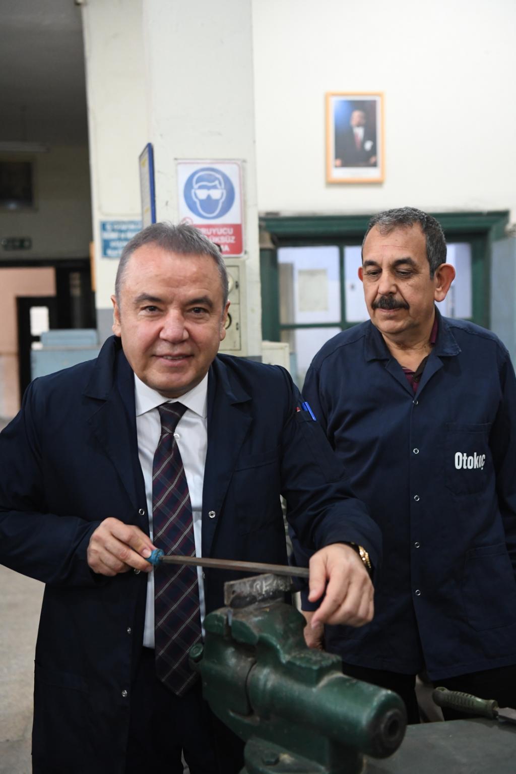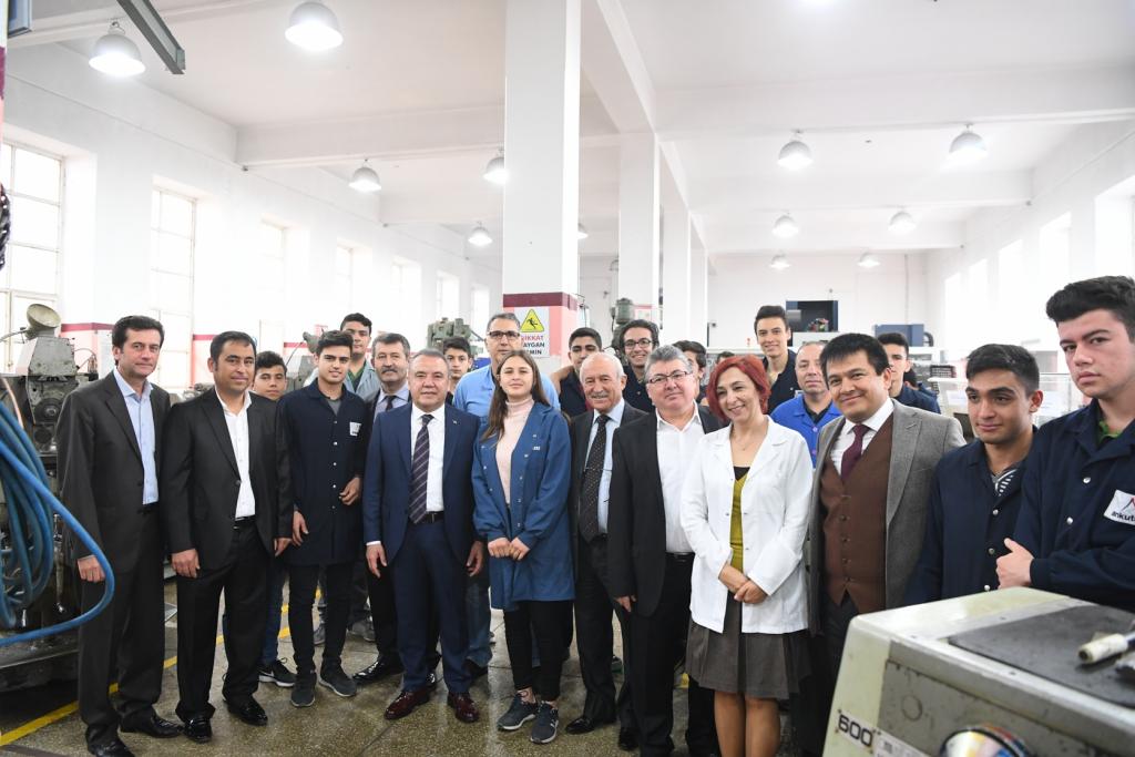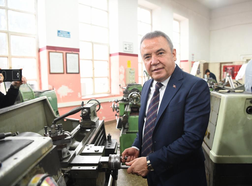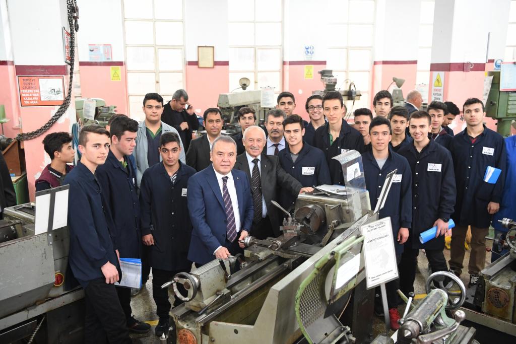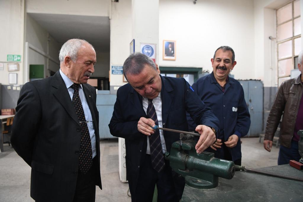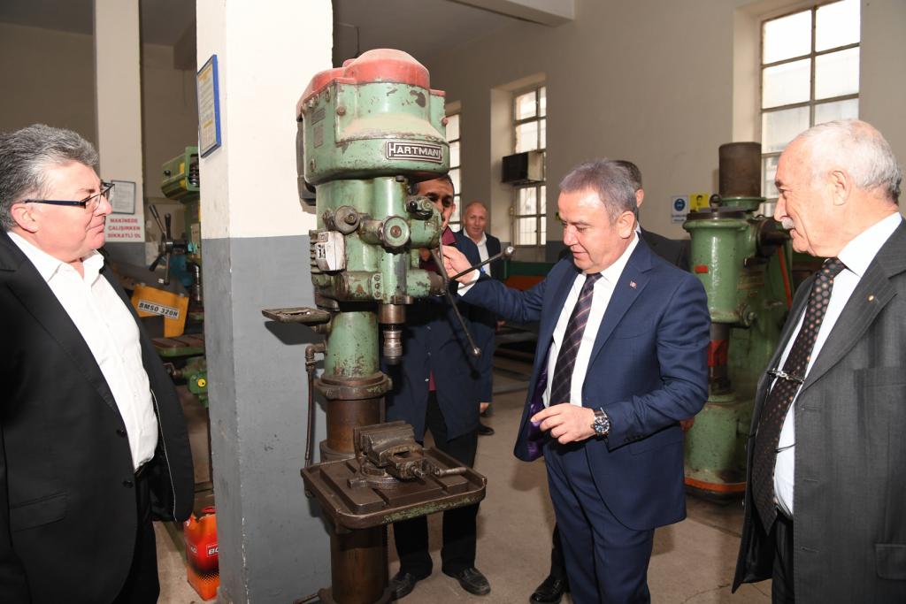ANTEMDER Başkanı Orhan Yüksel’de Başkan Muhittin Böcek’e günün anısına okulun çerçeveli fotoğrafını hediye etti. Başkan Muhittin Böcek, Okul Müdürü Hasan Yılmaz ile makamında bir süre sohbet etti. Daha sonra okulu gezen Muhittin Böcek, sınıfta sıraya oturarak, öğrencilerle sohbet etti. Endüstri Meslek Lisesi’nin atölyelerinde okul günlerini tazeleyen Başkan Muhittin Böcek, iş önlüğü giyerek demir eğeledi. Konyaaltı Belediye Başkanı Muhittin Böcek, atölyelerde öğretmen ve öğrencilerle eski anılarını paylaşarak, okul günlerini yad etti. Başkan Muhittin Böcek, ANTEMDER Başkanı Orhan Yüksel ve Okul Müdürü Hasan Yılmaz’a misafirperverliklerinden dolayı da teşekkür etti.