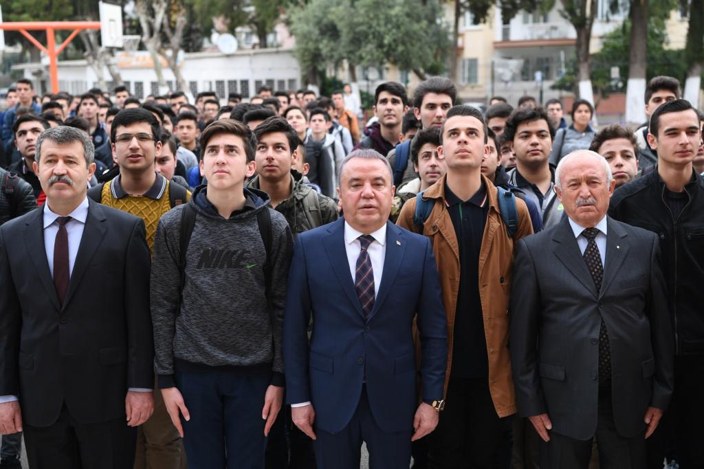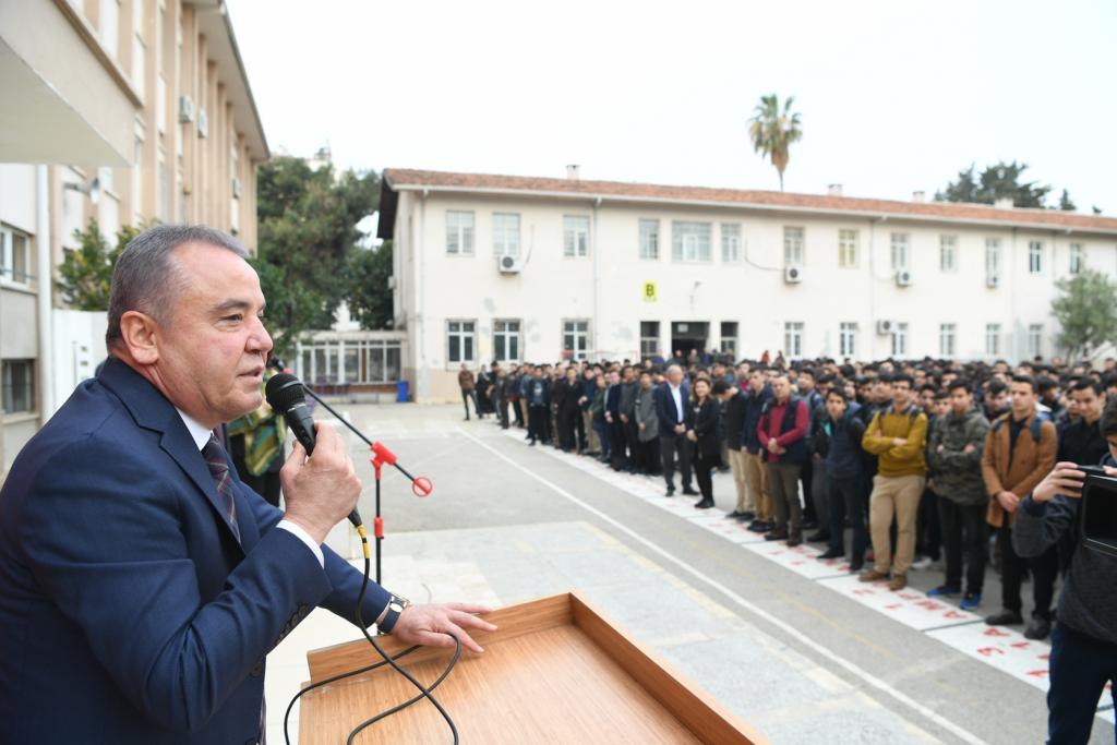 Antalya Teknik ve Endüstri Meslek Lisesi Mezunları Derneği (ANTEMDER) Endüstri Meslek Lisesi’nden mezun olmuş farklı meslek ve kariyer sahibi başarılı kişileri “Okula Dönüş” projesiyle bir araya getiriyor. 1980 yılında Endüstri Meslek Lisesi Metal İşleri Bölümü’nden mezun olan Konyaaltı Belediye Başkanı Muhittin Böcek’te proje kapsamında öğrencilerle bir araya geldi. Haftanın ilkokul günü, sabahın erken saatlerinde öğrencilerle okul önünde sıraya giren Başkan Muhittin Böcek, İstiklal Marşı okudu. Sonrasında ise öğrencilere seslendi.