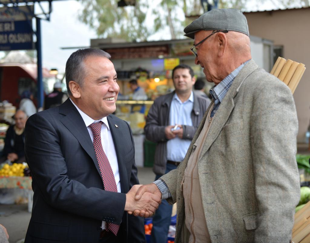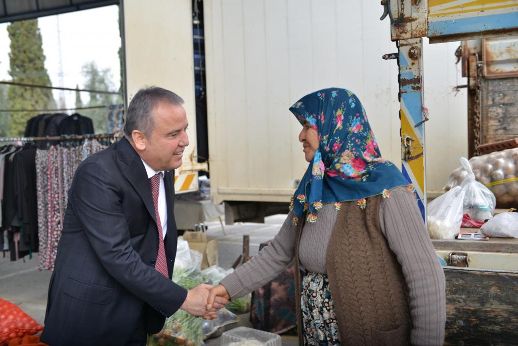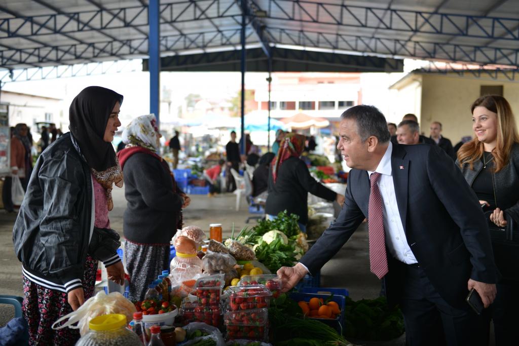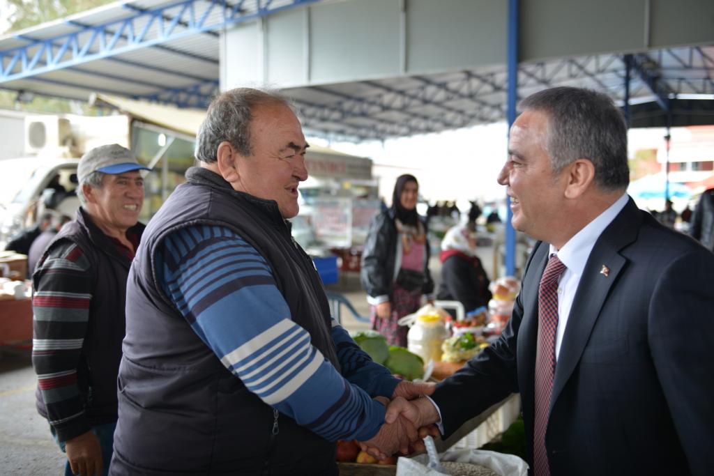 Her fırsatta vatandaşlarla bir araya gelen Konyaaltı Belediye Başkanı Muhittin Böcek, Çakırlar Mahallesi’nde pazarcı esnafını ziyaret etti. Çakırlar Kapalı Semt Pazarı’nda tek tek tezgahları ziyaret eden Başkan Muhittin Böcek, esnaf ile selamlaşıp sohbet etti. Pazar alışverişi yapan Muhittin Böcek’e esnaflar tadar vatandaşlar da yoğun ilgi gösterdi.