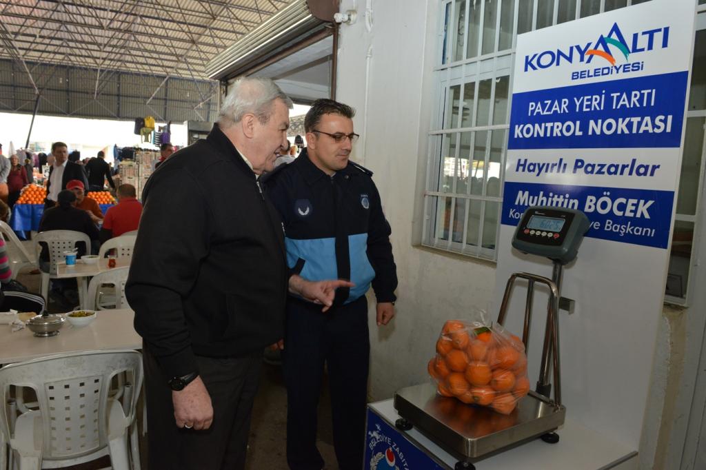 Konyaaltı Belediye Başkanı Muhittin Böcek, pazar alanlarının düzenli ve temiz tutulması konusunda gösterdikleri hassasiyeti, pazar yerlerinden alışveriş yapan vatandaşların haklarının korunmasına yönelikte gösterdiklerini bildirdi. Bu anlamda tüm kapalı pazar yerlerinin giriş bölümlerine hassas terazi koyduklarını dile getiren Başkan Böcek, hassas ölçüm yapan bu teraziler sayesinde alışveriş yapan vatandaşların gramaj konusundaki endişelerini de giderdiklerini kaydetti.