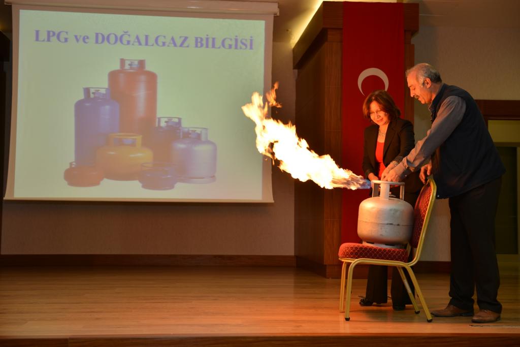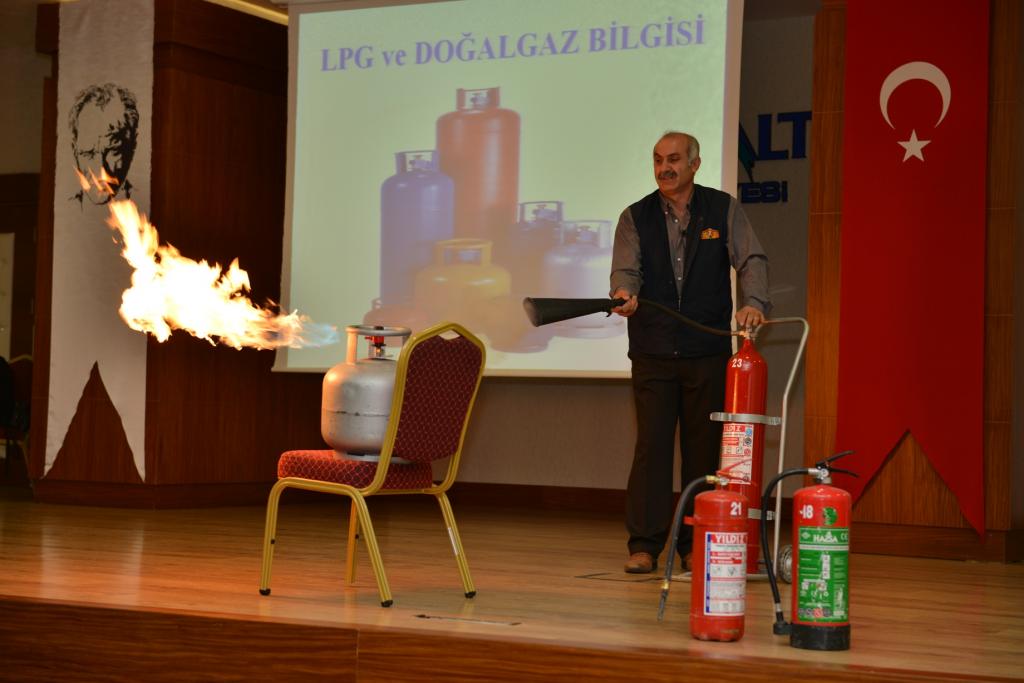 Eğitim ve Önleme Şube Müdürlüğü’nde görevli konusunda uzman Şaban Kibar, belediye hizmet binalarında ve evlerde meydana gelebilecek her türlü yangının söndürülmesi, doğalgaz ve LPG kaçaklarına nasıl müdahale edileceği, yanan bir canlıya nasıl müdahale edilmesi gerektiği, binaların en güvenli şekilde tahliye edilmesi gerektiği, binalarda alınması gereken yangın önlemleri ve yangın söndürme sistemlerinin kullanılması konularında görsel ve tatbiki eğitim verdi.