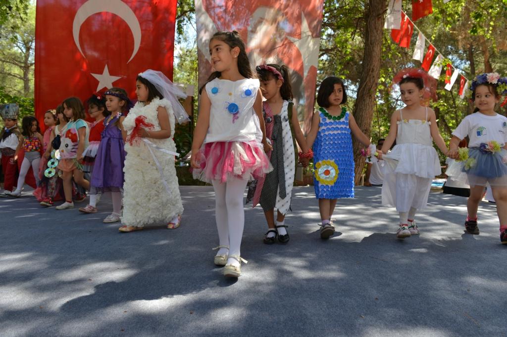 Öğrencilerin kortej yürüyüşüyle başlayan şenlikte anaokulu öğrencilerinin gösterileri büyük ilgi gördü. Atık malzemelerin elbiseye dönüştürüldüğü defilede, minik öğrenciler elbiseleri üzerlerine giyerek sergiledi.
