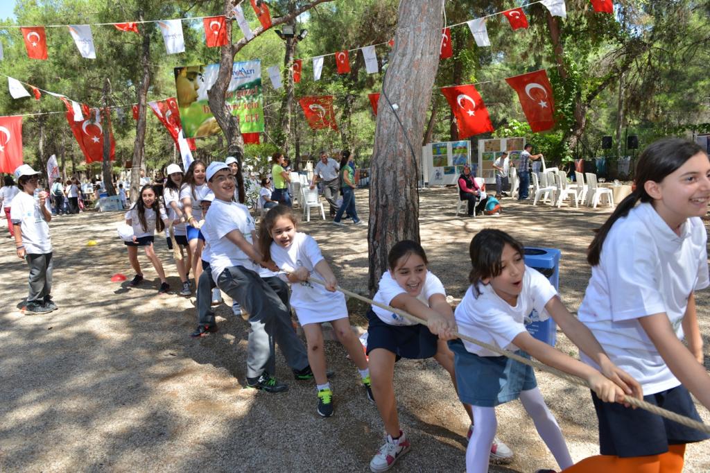 Şenlik alanında oluşturulan dev tuvale el izlerini bırakan öğrenciler, geri dönüşüm bowling, halat çekme, çuval yarışı, geri dönüşüm parkur oyunlarıyla doyasıya eğlendi.