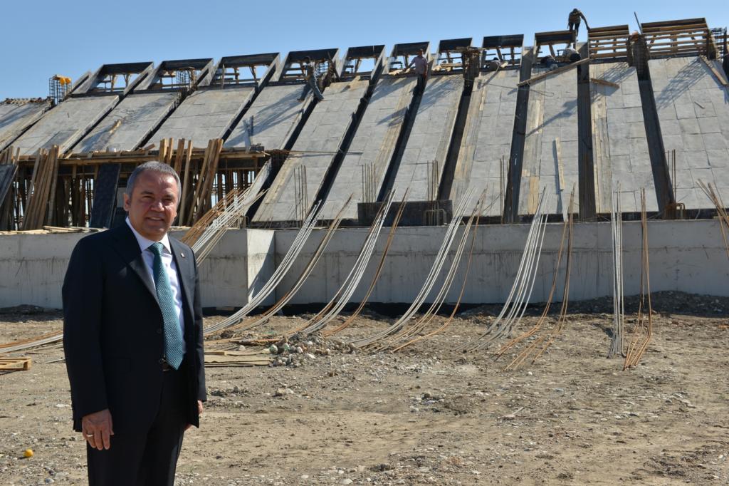 Liman Mahallesi’nde 14 bin 500 metrekare alana inşa edilen stadyum, hızla yükseliyor. Basın mensuplarıyla birlikte hizmet gezisi turu yapan Konyaaltı Belediye Başkanı Muhittin Böcek, ilk olarak 3 bin kişilik stadyumun da yer aldığı Spor Kompleksi Projesini inceledi.