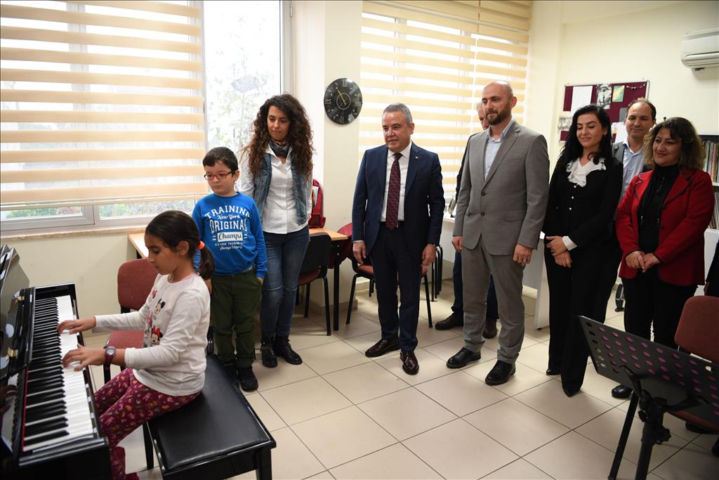 Muhittin Böcek, küçük yaşta piyanoya ilgi duyan ve bu alanda büyük yeteneği olduğu tespit edilen Elif Beste Aydın’ı sınıfında ziyaret etti. Kendisinin fırsat buldukça müzikle ilgilendiğini söyleyen Muhittin Böcek, çaldığı bağlama ile de bu alanda ki yeteneğini ortaya koydu. Başkan Muhittin Böcek, Bilim ve Sanat Merkezi ardından Korkuteli’nde Kızılcadağ İlk ve Ortaokulu’nu ziyaret etti.