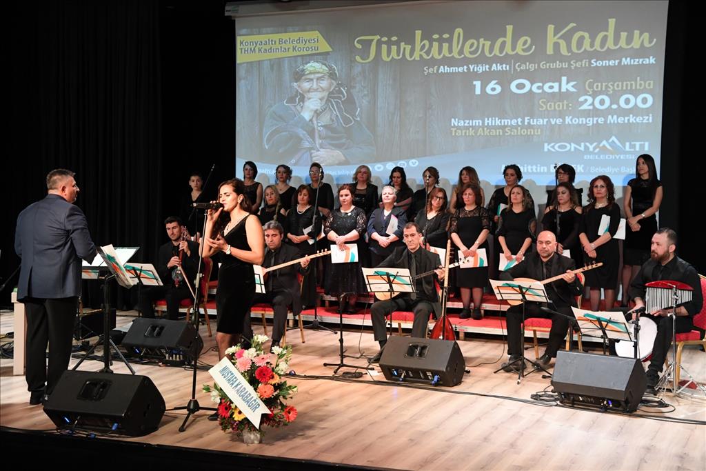 Konyaaltı Belediyesi THM Kadın Korosu, Nazım Hikmet Fuar ve Kongre Merkezi’nde Tarık Akan Salonu’nda sahne aldı. Türkülerde Kadın Konseri’yle gönüllere taht kurmuş türküler seslendiren THM Kadın Korosuna, Ahmet Yiğit Aktı şeflik etti. Konser, Yağcıoğlu Fehmi Efe’den derlenen “Ali’m gitme pazara” isimli Ankara türküsüyle başladı. Ardından Ayşe Gökay “Ey sevdiğim bir gün bana yar demedin”, Sultan Erdoğan “Derman sendedir” türküleriyle sahne aldı.