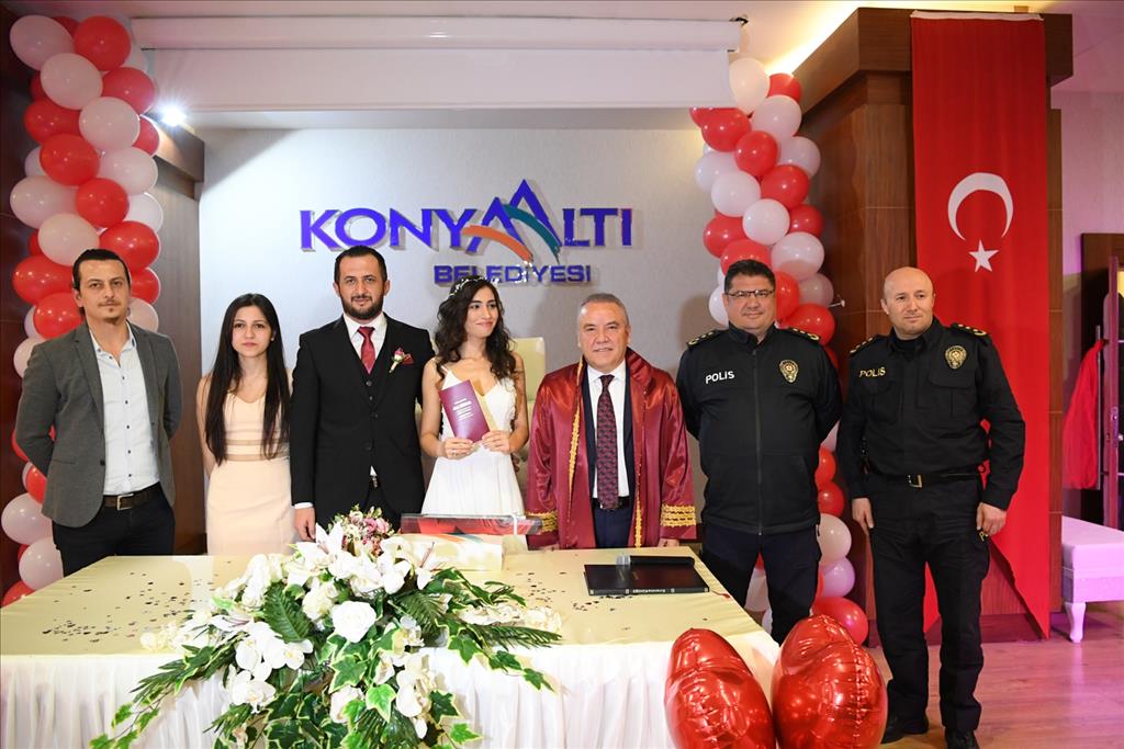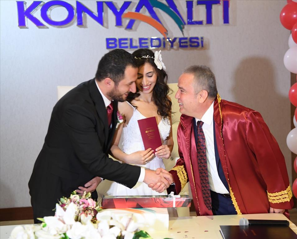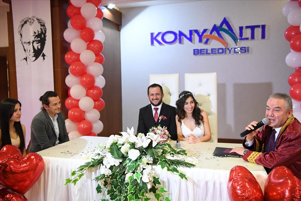 14 Şubat Sevgililer Günü’nü anlamlı kılmak isteyen çiftler bugün soluğu nikah salonlarında aldı. Konyaaltı Belediyesi nikah salonu en yoğun günlerinden birini yaşadı. 14 Şubat Sevgililer Günü’nde Konyaaltı Belediyesi’nde 14 çiftin nikahı kıyıldı. Cumhuriyet Halk Partisi Antalya Büyükşehir Belediye Başkan Adayı ve Konyaaltı Belediye Başkanı Muhittin Böcek’te bu günü anlamlı kılmak isteyen çiftlerden Emre Konukcu ve Göksu Güder’in nikah akdini gerçekleştirdi.