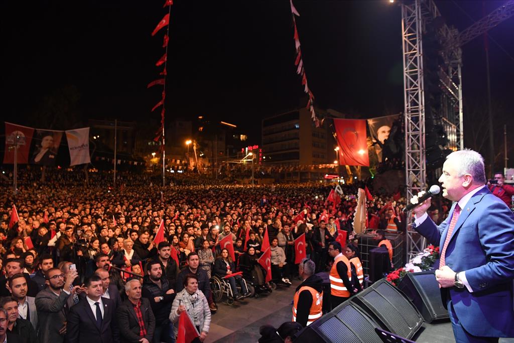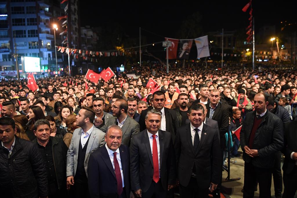 Çok anlamlı ve özel bir günde Antalyalı hemşehrilerimle bir arada olmaktan büyük mutluluk duyduğunu söyleyen Antalya Büyükşehir Belediye Başkan Adayı ve Konyaaltı Belediye Başkanı Muhittin Böcek, “Türkiye’nin kurtarıcısı Gazi Mustafa Kemal Atatürk’ün Antalya’ya gelişinin 89. yıl dönümünde sizlerle beraberiz. Allah bu birlik ve beraberliğimizi bozmasın. 25 yıllık siyasi hayatımda bizi seven, seçen siz değerli hemşehrilerimi mahcup etmeden belediye başkanlığı yaptım. Bütün çalışmalarımı Mustafa Kemal Atatürk’ün devrim ve ilkeleri doğrultusunda yaptım. Ben ‘Andımız ile 23 Nisan, 19 Mayıs, 30 Ağustos ve Cumhuriyet Bayramı ile büyüdüm. Günü geldi bu meydanlarda bizlere Atamızın anmasını bile yaptırmadılar. Sizlerin desteği ile 31 Mart’ta Antalya’mızda yepyeni bir güneşli gün doğacak. Bundan sonra çalışmalarımı aynı azim ve kararlılıkla Gazipaşa’dan Kaş’a kadar kimseye ötekileştirmeden, Türkiye Cumhuriyeti vatandaşı olan herkesle birlikte Antalya’mızı yöneteceğiz” dedi.