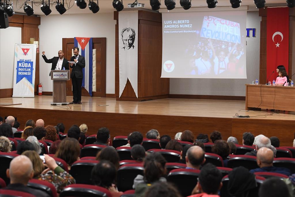 İlk konuşmayı yapan Büyükelçi Luis Alberto Amoros Nunez, Fidel Castro’nun fikirlerinin bugün çok daha gerçek olduğunu belirterek, “Fidel’in aramızdan ayrılmasından sonra Küba’da neler olduğu sorusuna yanıt olarak bugün Küba’nın her zamankinden daha Fidel’ci olduğunu söyleyebilirim. Castro bütün Kübalıların eseriyle her zamankinden daha bizimle. Bugünkü etkinlikle de, Fidelsiz Küba’da Emperyalizmin saldırıları karşısında direnemeyeceğini düşünenlere bir mesaj vermek isteriz: Küba’da ihanet olmayacak. Fidel’in bize bıraktığı yüce mirası korumayı her zaman bileceğiz.” dedi.