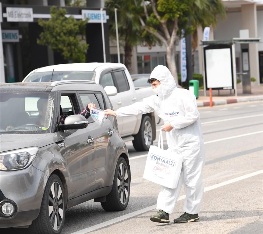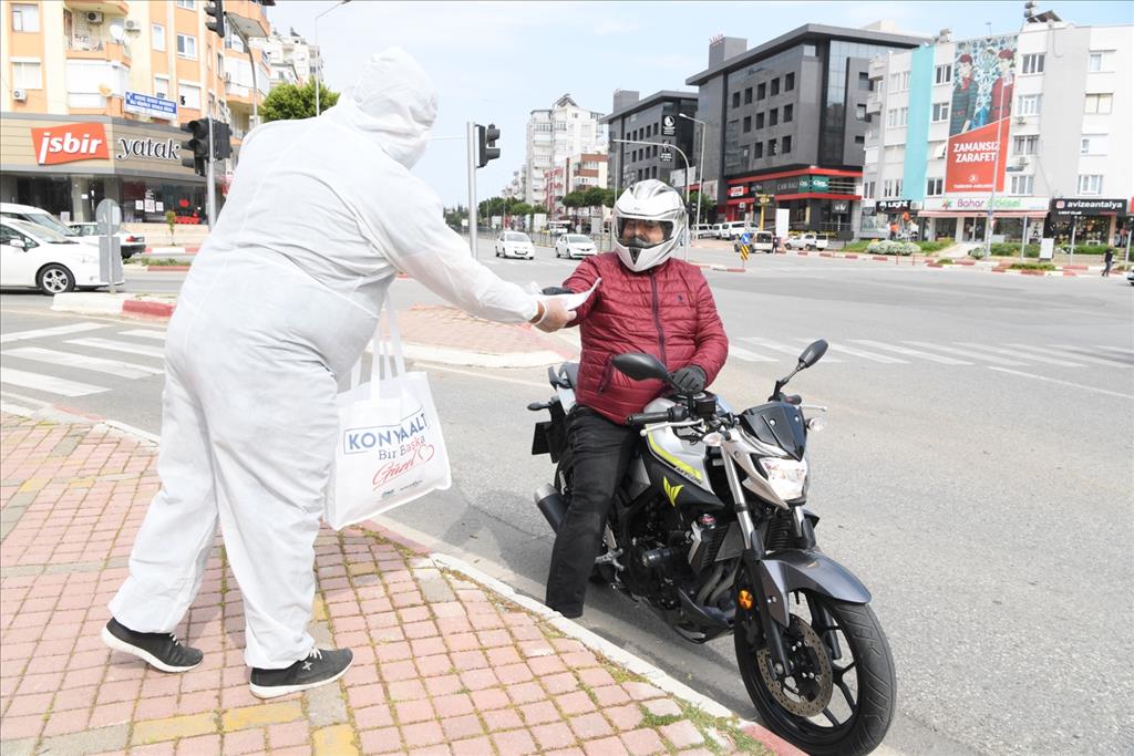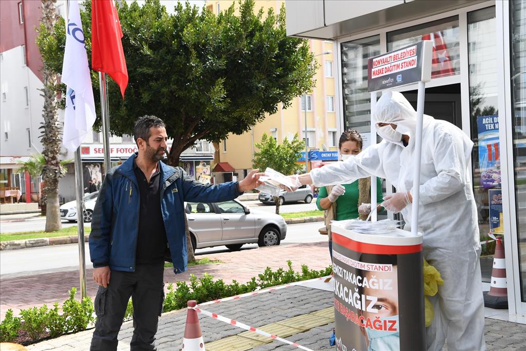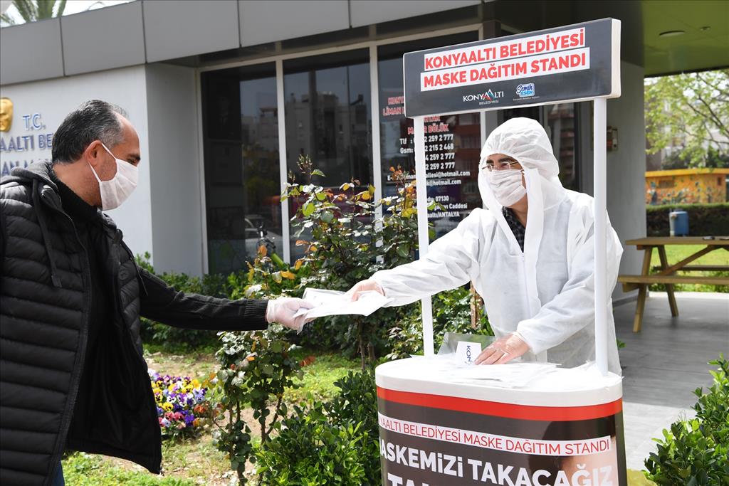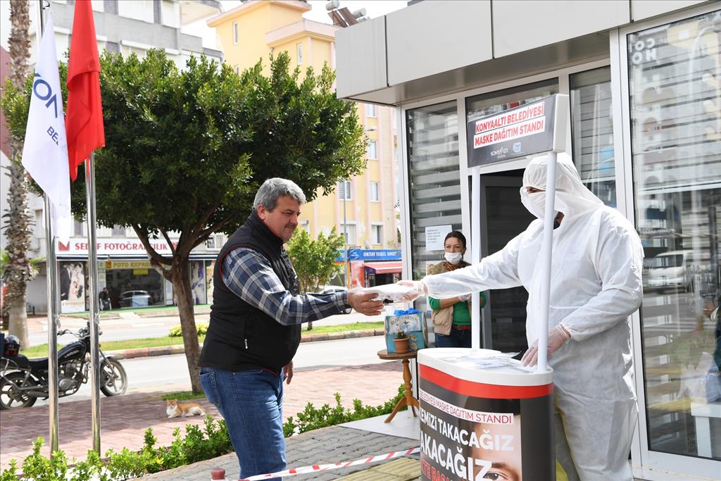 Konyaaltı Belediyesi ekipleri, koronavirüs salgınıyla mücadele çalışmalarını ilçenin dört bir yanında planlı bir şekilde sürdürüyor. Ekipler maske ve eldivenden oluşan kiti hızla vatandaşlara ulaştırmaya çalışıyor. Belediye ekipleri, tüm sokak, kavşak ve caddelerde vatandaşa kit dağıtımını sürdürüyor. Gürsu ve Liman Mahalleleri Muhtarlığı önünde kurulan stantlarda vatandaşlara maske kiti dağıtımı gerçekleştirildi. Bununla birlikte cadde ve kavşaklarda da maske dağıtımı devam ediyor.