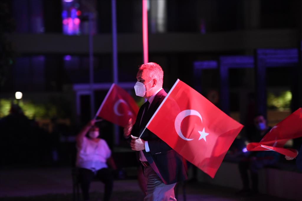 Konyaaltı Belediyesi, Cumhuriyet'in 97’nci kuruluş yıl dönümünü özel bir etkinlikle kutladı. Konyaaltı Belediyesi önünde gerçekleştirilen kutlama töreni covid 19 tedbirleri kapsamında gerçekleştirildi. Alana girişlerde maska dağıtılarak, vatandaşların ateş ölçümleri yapıldı. ‘O’nun sesi bir asırdır kulağımızda’ isimli Cumhuriyet kutlamasına, Konyaaltı Belediye Başkanı Semih Esen, Cumhuriyet Halk Partisi (CHP) eski Antalya İl Başkanı Ahmet Kumbul, Muratpaşa Belediyesi Başkan Yardımcısı Hüseyin Sarı, meclis üyeleri, başkan yardımcıları ve vatandaşlar katıldı. Saatler 19.23’ü gösterdiğinde saygı duruşunun ardından okunan İstiklal Marşı’yla Cumhuriyet kutlaması başladı. Yurttaşlar ellerinde Türk Bayrakları ile marşlar ve şarkılarla Cumhuriyet Bayramı coşkusunu yaşadı. Sahilde yürüyüş yapan ve oturan vatandaşlar da bu coşkuya ortak oldu.