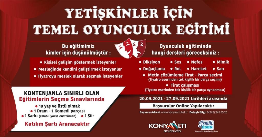 Konyaaltı Belediyesi, yetişkinler için temel oyunculuk eğitimi düzenleyecek. Deneyimli eğitmenler ve tiyatronun usta isimlerinin vereceği kurs, 6 ay sürecek. Haftada 8 saat şekilde planlanan kursa, 18 yaş ve üstü vatandaşlar katılabilecek. Başvurular 20 ile 27 Eylül tarihleri arasında www.konyaaltı.bel.tr üzerinden online yapılabilecek. 24 kişi ile sınırlı olan eğitimlere öğrenciler seçme sınavı ile alınacak. Sınava dram ya da bir komedi parçası bilen, şarkı (çalabiliyorsa enstrüman) söyleyebilen ve şiir okuyan kişiler başvurabilecek.