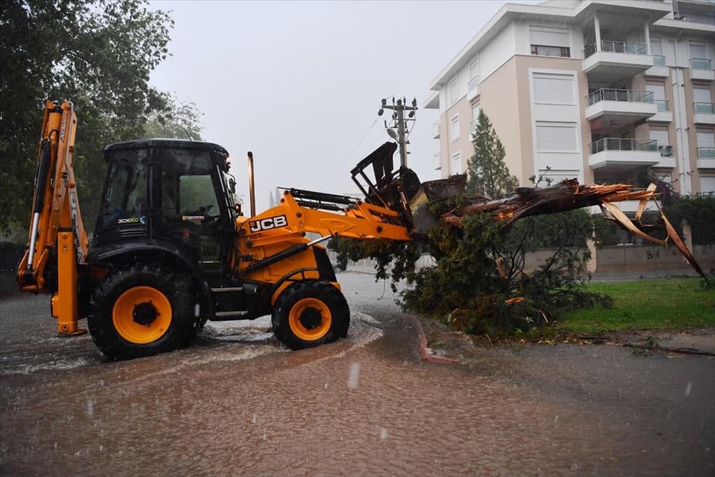 Antalya’da gece saatlerinde başlayan, il genelinin yanı sıra Konyaaltı’nı da olumsuz etkileyen fırtına nedeniyle çok sayıda ağaç gövdesinden ayrıldı. Saatteki hızı 120 kilometreyi aşan fırtına nedeniyle Konyaaltı Belediye Başkanı Semih Esen’in talimatıyla belediye ekipleri gece saatlerinden itibaren teyakkuz haline geçti. Gece itibariyle fırtına nöbetine başlayan ekipler, devrilen ağaçlara anında müdahale etti. Zabıta ekipleri ilçe genelinde ring halinde gezerek yardım isteyen vatandaşlara destek oldu. Fen İşleri Müdürlüğü ekipleri de ağaç gövdeleri nedeniyle kapanan yollara kepçe ile müdahale ederken, bir yandan da su baskınları nedeniyle zor durumda kalan vatandaşlara yardım elini uzattı. Başkan Semih Esen, fırtına sona erene kadar ekiplerin nöbette kalmaya devam edeceğini söyledi.