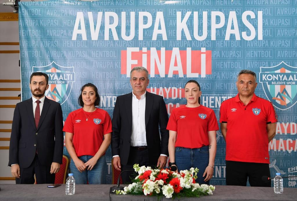 Kulüp tarihinde ilk kez Avrupa’da mücadele eden Konyaaltı Belediye SK Kadın Hentbol Takımı’nda final heyecanı yaşanıyor. İspanya temsilcisi Atletico Guardes ile deplasmanda oynanan ve 23-17 skorla kaybedilen maçın Antalya’da oynanacak rövanş mücadelesi öncesinde düzenlenen basın toplantısında Konyaaltı Belediye Başkanı Semih Esen, Konyaaltı Belediye Spor Kulübü Başkanı Şevket Korkut, Kadın Hentbol Takımı Başantrenörü Birol Ünsal ve takım kaptanları Monica Janeska Kıldan ile Yasemin Şahin basın mensuplarının sorularını yanıtladı. Türk hentbolu adına çok önemli bir maça çıkacaklarının altını çizen Konyaaltı Belediye Başkanı Semih Esen, takımın motivasyonunun son derece yüksek olduğunu ve Antalyalı sporseverlerin desteğiyle kupayı alan taraf olacaklarına inandığını söyledi. İspanya’da oynanan ilk maçta tam bir hakem faciası ile karşılaştıklarını belirten Başkan Esen, ‘’Maçın ilk 10 dakikasında takımımız sürekli hücum fauller ile durdurulmaya çalışıldı ve bu durum maç boyunca devam etti. Maçtan sonra konuştuğumuz spor adamları çalınan faullerin yüzde 80’inin faul olmadığını söyledi. Adil bir yönetimle kupayı alacağımıza inanıyoruz’’ dedi.