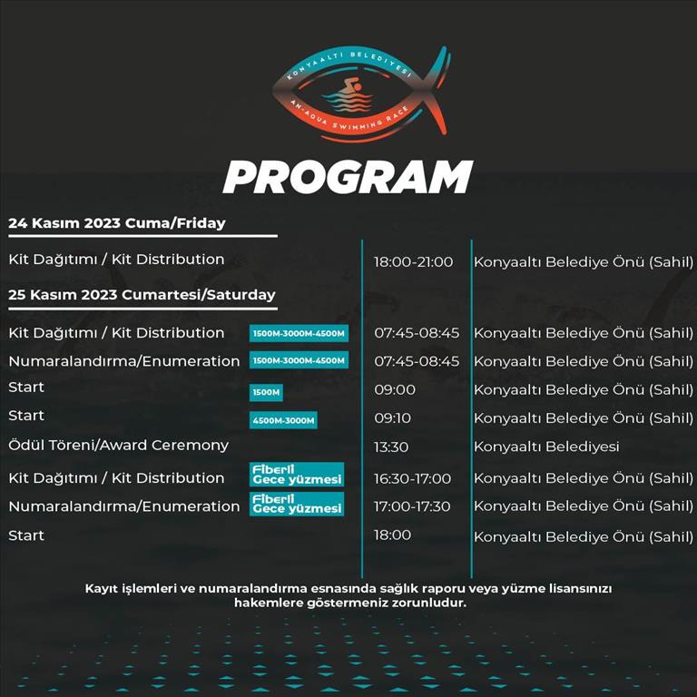 Konyaaltı Belediyesi, geçtiğimiz yıl ilkini düzenlediği “Uluslararası An Aqua Swimming Race” yüzme yarışının ikincisini düzenliyor. 25 Kasım Cumartesi (yarın) Konyaaltı Belediyesi önünden startı verilecek yarışta 8 ülkeden 400 sporcu mücadele edecek. Etkinlik programına göre, saat 09.00’da 1500 metre yarışının, 09:10’da ise 3000 ve 4500 metre yarışının startı verilecek. 09.00 ve 09.10’da başlayan yarışlarda dereceye giren sporcular 13.30’da düzenlenecek ödül töreniyle ödüllerini alacak. Saat 18.00’de düzenlenecek gece etabıyla etkinlik sona erecek.