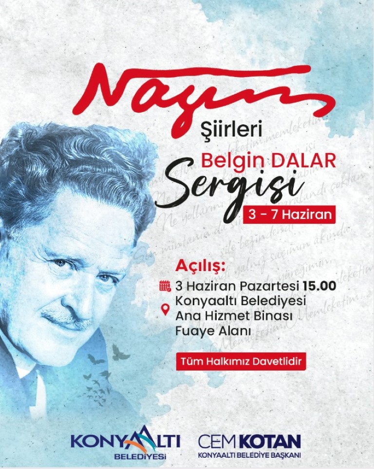 Usta şair Nazım Hikmet’i ölümünün 61. yılında “Nazım Şiirleri Sergisi” ile anacaklarını ifade eden Konyaaltı Belediye Başkanı Cem Kotan, “Nazım Hikmet, aşkı, hapisliği, sürgünlüğü, özlemi iliklerine kadar hissetmiş ve bu hissettiklerini şiirlerine aktarmış usta bir şairimizdir. Nazım Hikmet tanıklık ettiği çağın sesi olmuştur. Bizler de şiirleri elliden fazla dile çevrilen, eserleri birçok ödül alan, Türkiye'de serbest nazımın ilk uygulayıcısı ve çağdaş Türk şiirinin en önemli isimlerinden olan usta şairimizi açacağımız sergiyle anacağız. Sergimize tüm vatandaşlarımızı davet ediyorum” dedi. Belgin Dalar’ın “Nazım Şiirleri Sergisi” ücretsiz olup, 7 Haziran’a kadar gezilebilecek.