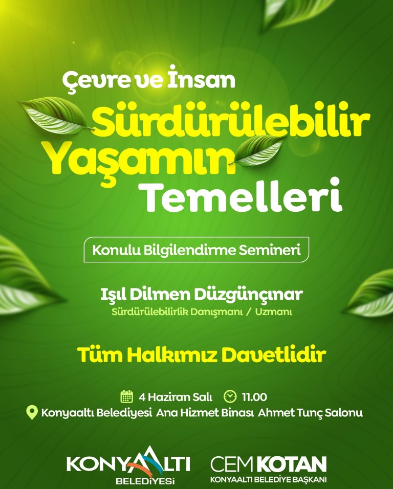 Konyaaltı Belediyesi 5 Haziran Dünya Çevre Günü kapsamında bir dizi etkinlik düzenleyecek. Etkinlikler kapsamında ilk olarak 4 Haziran Salı Günü saat 11.00’de Konyaaltı Belediyesi Ana Hizmet Binası’nda sürdürülebilirlik danışmanı Işıl Dilmen Düzgünçınar tarafından “Çevre ve İnsan-Sürdürülebilir Yaşamın Temelleri” konulu bir seminer verilecek.