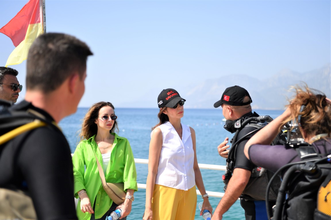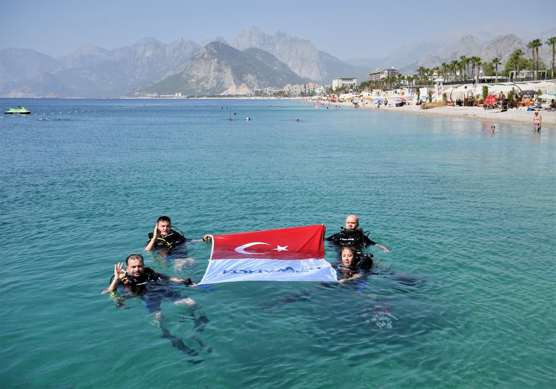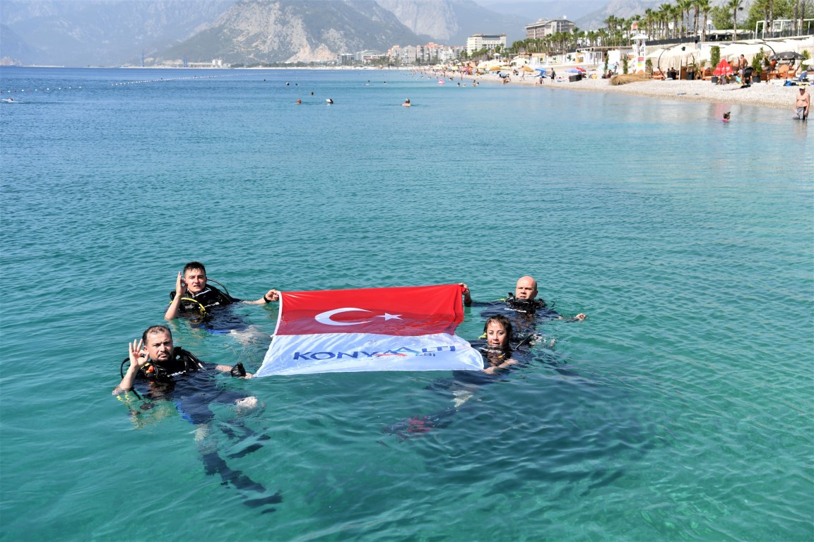 Etkinliklerin ikinci günü Konyaaltı Sahili’nde gerçekleşti. Konyaaltı Belediyesi Afet İşleri Müdürlüğü ekipleri Konyaaltı Sahili’ne dalış yaparak deniz dibi temizliği yaptı. Denizden çok sayıda cam şişe, demir profil, tahta parçası gibi atık madde çıkaran ekipler ardından denizde Türk bayrağı açtılar.