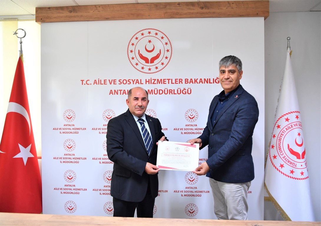 Antalya Aile ve Sosyal Hizmetler il Müdürlüğü’nde düzenlenen sertifika törenine Antalya Aile ve Sosyal Hizmetler İl Müdürü Galip Sökmen, Konyaaltı Belediye Başkan Yardımcısı Veysel Akyar, Konyaaltı Belediyesi Park ve Bahçeler Müdürü Öncü Ceylan Baloğlu ve STK temsilcileri katıldı. Antalya Aile ve Sosyal Hizmetler İl Müdürü Galip Sökmen, erişilebilir park sertifikasını Konyaaltı Belediye Başkan Yardımcısı Veysel Akyar’a takdim etti.