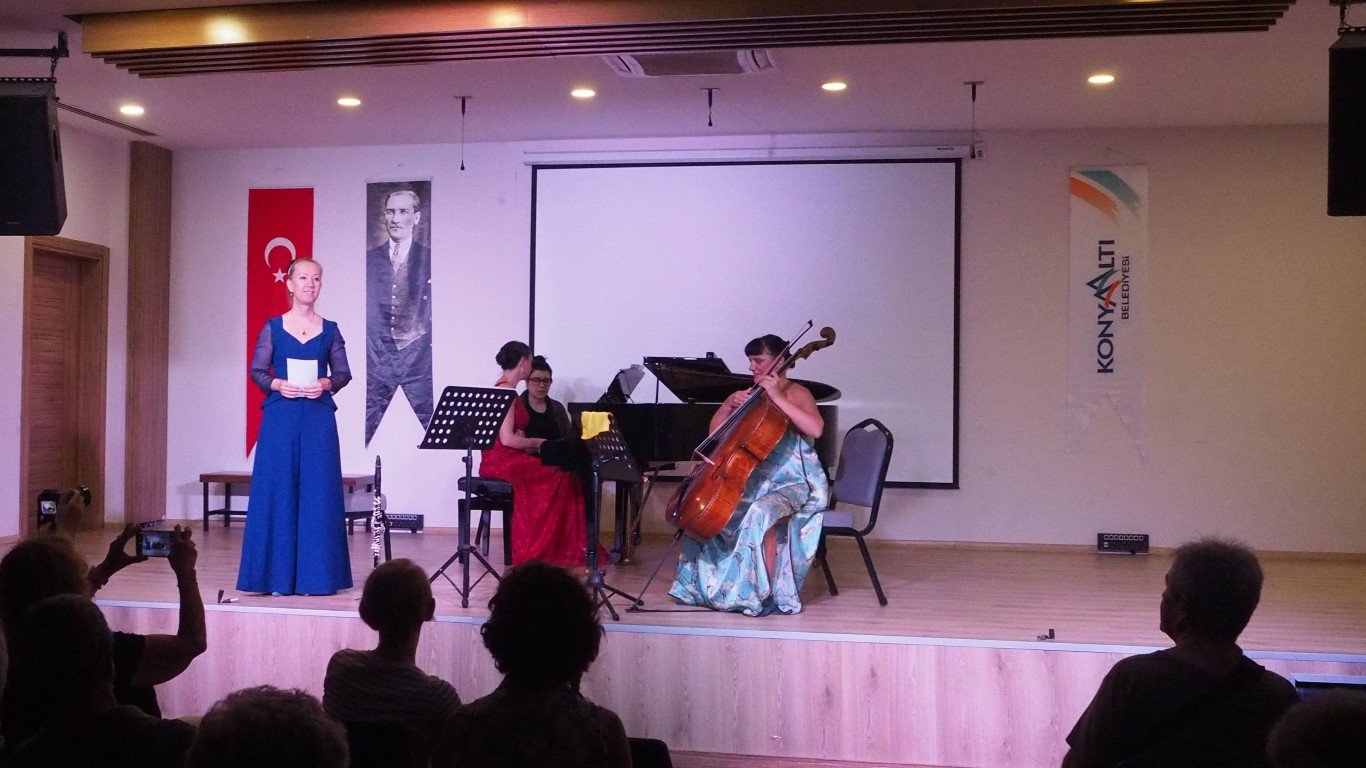 Konyaaltı Belediyesi Müzik Akademisi’nin düzenlediği “Klasikten Romantiğe Yolculuk” isimli oda müziği konseri, Müzik Akademisi Konser Salonu’nda gerçekleştirildi. Piyanoda Ekaterina Aktı, klarnette Elif Aksoy ve viyolonselde Çağla Bilgin’in yer aldığı grup, izleyenlerin büyük beğenisini topladı.Geniş bir repertuvarla dinleyicilerine muhteşem bir müzik ziyafeti sunan müzisyenler, izleyiciler tarafindan dakikalarca ayakta alkışlandı.