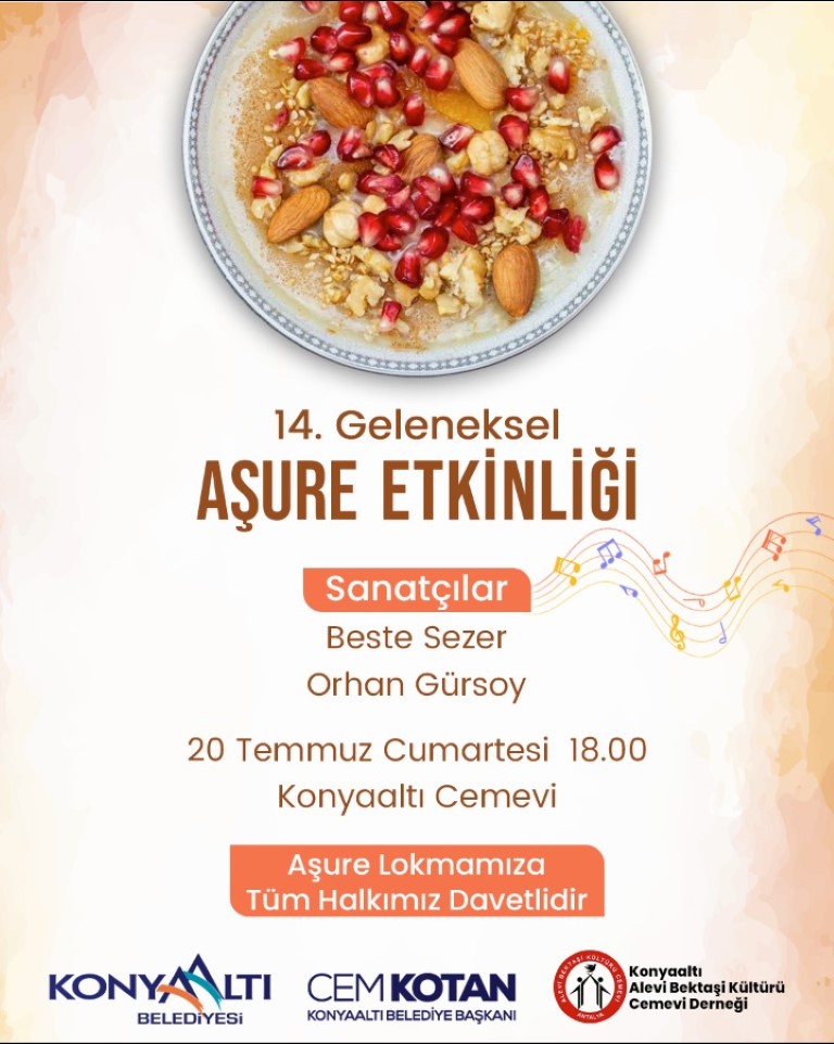 Konyaaltı Belediyesi’nin Konyaaltı Alevi Bektaşi Kültürü Cemevi Derneği ile bu yıl 14’üncüsünü düzenleyeceği Geleneksel Aşure Etkinliği 20 Temmuz Cumartesi günü saat 18.00’de Konyaaltı Cemevi’nde gerçekleştirilecek. Etkinlikte vatandaşlara aşure dağıtılacak. Ardından sanatçılar Beste Sezer ve Orhan Gürsoy konser verecek.