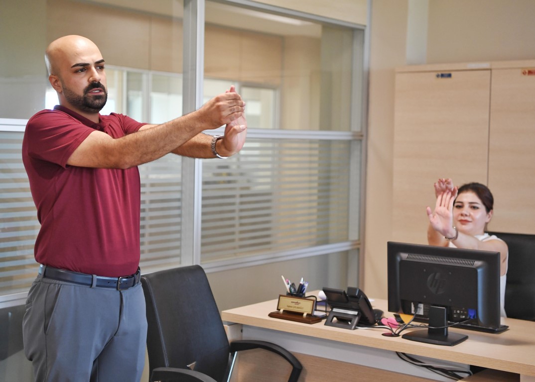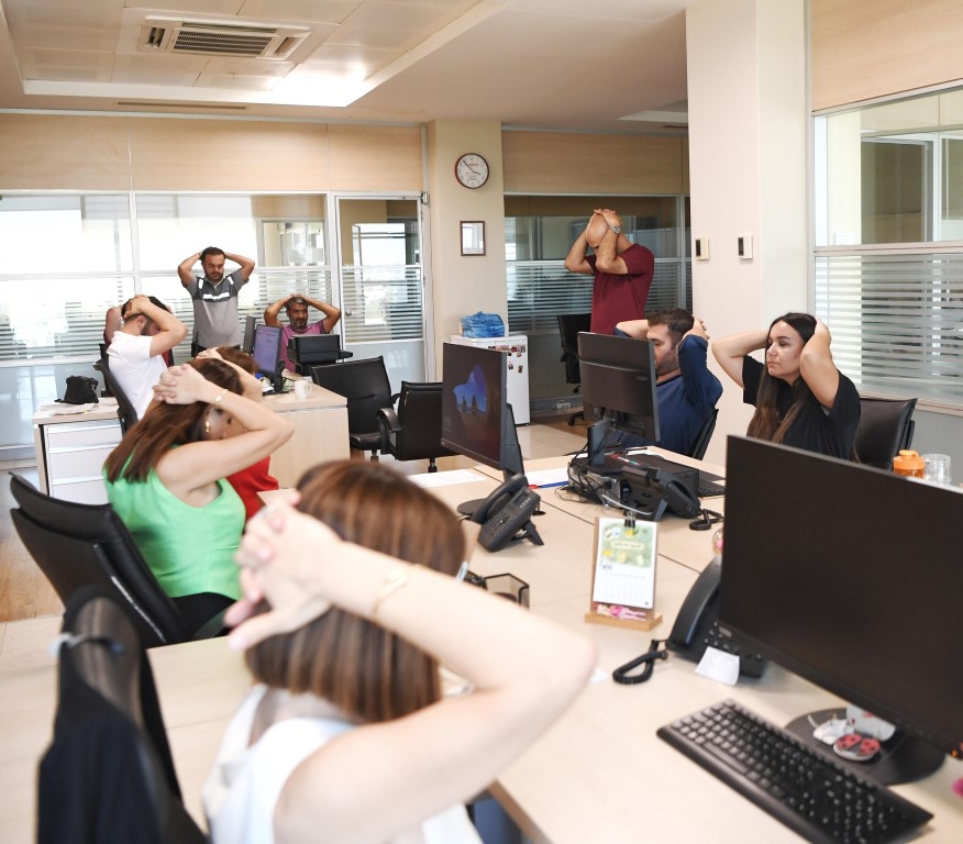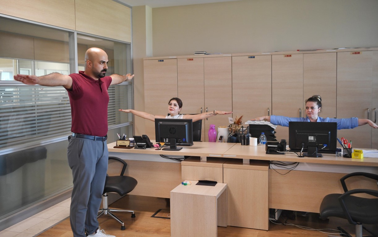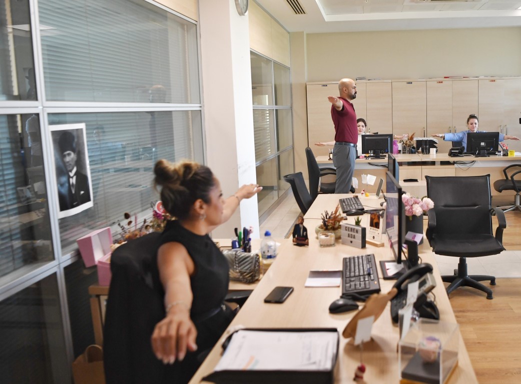 Konyaaltı Belediyesi Spor İşleri Müdürlüğü tarafından gerçekleştirilen uygulama kapsamında spor eğitmenleri her gün 15 dakika boyunca belediye personeline masa başında yapılması gereken spor hareketlerini uygulamalı olarak gösteriyor.