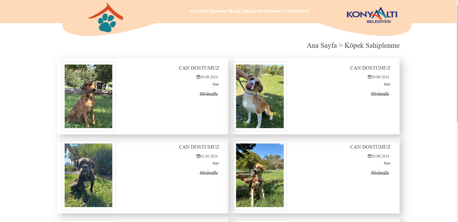 Rehabilitasyon merkezinin sahiplendirmeye çok önem verdiklerini belirten Dalkıran, bunun için E-Pati uygulaması başlatıldığını kaydetti. Vatandaşların E- Pati uygulamasıyla rehabilitasyon süreçlerini tamamlayan can dostlarını görebileceklerini, hayvan hakkında bilgi alabileceklerini kaydetti. Ayrıca ilgili sitede, sahiplendikten sonra ihtiyaç listelerinin neler olduğunu görebileceklerini söyleyen Dalkıran, “Tedavi süreci tamamlanan kediler sağlıklarına kavuşmalarının ardından alındıkları yere bırakılırken, köpekleri ise yeni sahipleri gelene kadar merkezimizde bakıyoruz. Vatandaşlar, www.konyaalti.bel.tr adresinde yer alan E-Pati uygulaması aracılığıyla ya da https://epati.konyaalti.bel.tr adresinden barınaktaki dostlar hakkında detaylı bilgilere erişebilir, sahiplendirme sürecine katkıda bulunabilirler” diye konuştu.