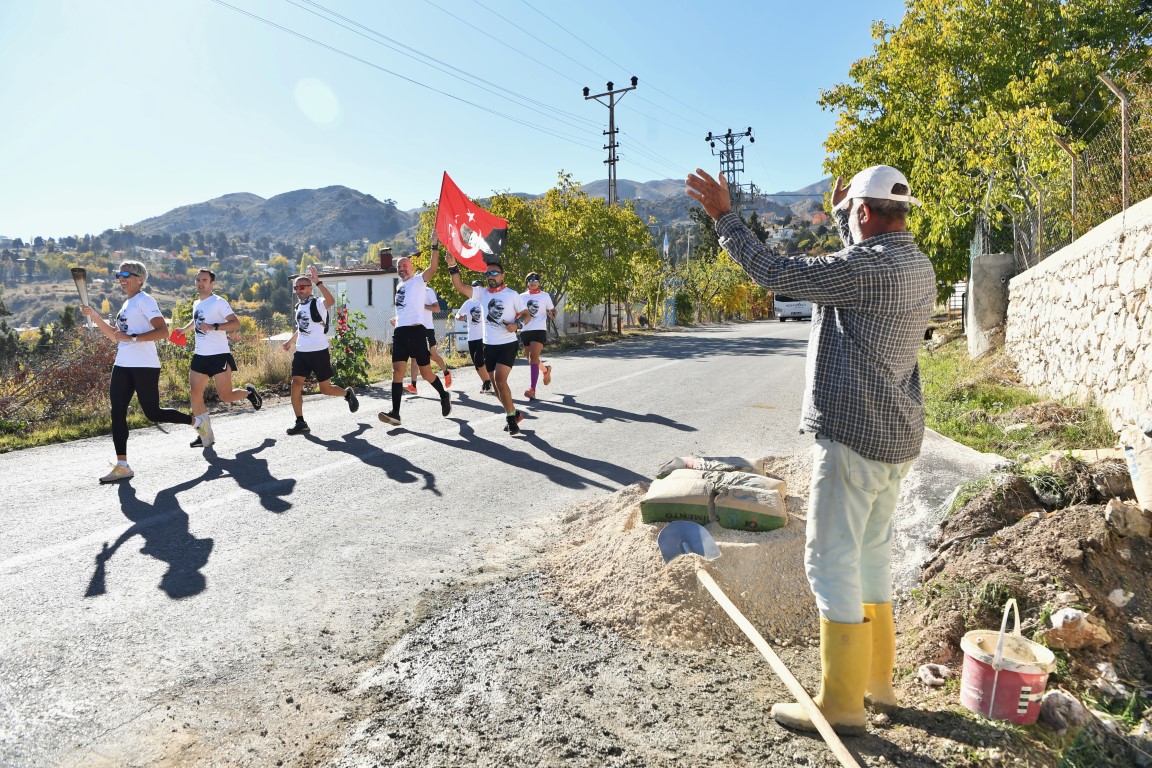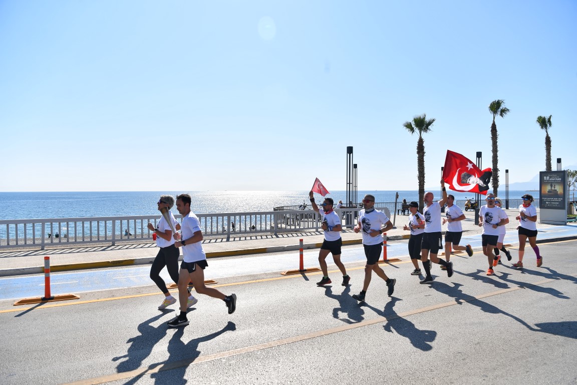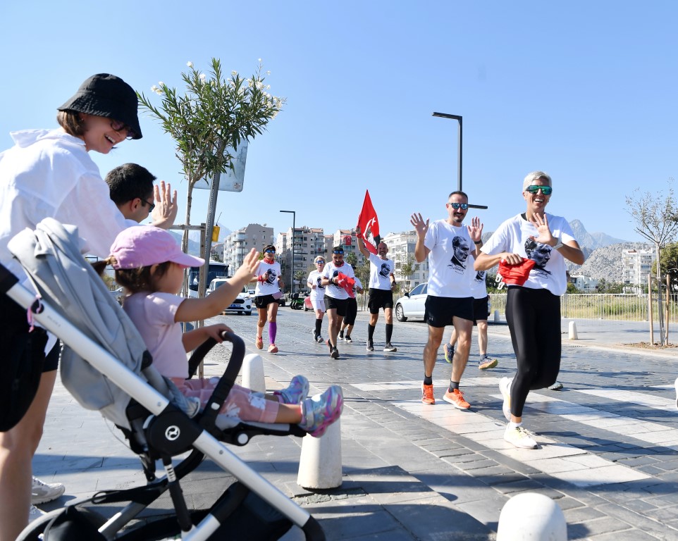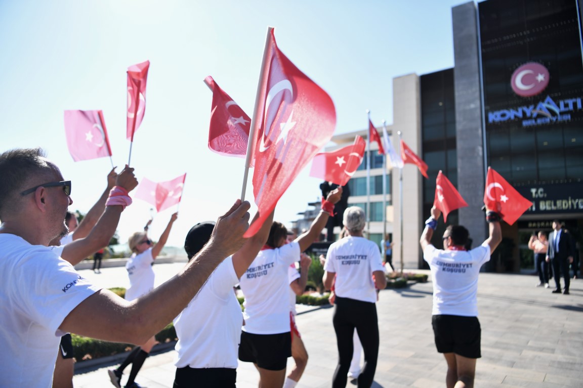 Konyaaltı Belediyesi, HayatPark’ta düzenlediği etkinliklerin yanı sıra, Feslikan Yaylası’ndan başlayarak belediye hizmet binası önünde tamamlanan Cumhuriyet Koşusu ile çok anlamlı bir organizasyona imza attı. Adım Adım Antalya grubu işbirliği ile düzenlenen etkinlikte 14 sporcu 41 kilometrelik parkurda Cumhuriyet için koştu. Feslikan Yaylası Güreş Sahası’nda aldıkları meşale ve Türk Bayrağını 14 mahalleyi geçerek Konyaaltı Belediyesi önüne getiren sporcular, Konyaaltı Belediye Başkanı Cem Kotan’a teslim etti. Bayrağı teslim alıp, 3 kez öperek alnına götüren Başkan Kotan, belediye önündeki Atatürk büstünün yanına kurulan sembolik meşaleyi yaktı.