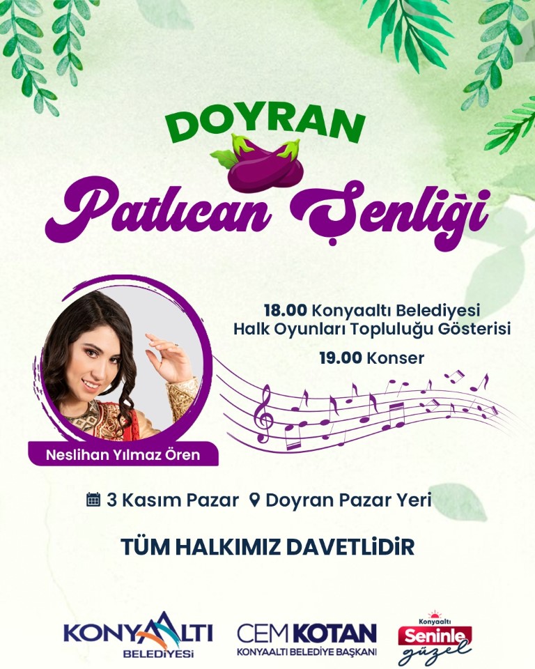 Konyaaltı belediyesi tarafından düzenlenen Doyran Patlıcan Şenliği 3 Kasım Pazar Günü vatandaşlarla buluşuyor. Patlıcanın tanıtımı, yerel lezzetlerin keşfi ve yöresel kültürün yaşatılması amacıyla gerçekleşecek olan şenlikte konser ve halk oyunları etkinlikleri yer alacak. Şenlik programında Saat 18.00’de Konyaaltı Belediyesi Halk Oyunları Topluluğu gösterisi, 19.00’da Neslihan Yılmaz Ören ziyaretçilere keyifli anlar yaşatacak.