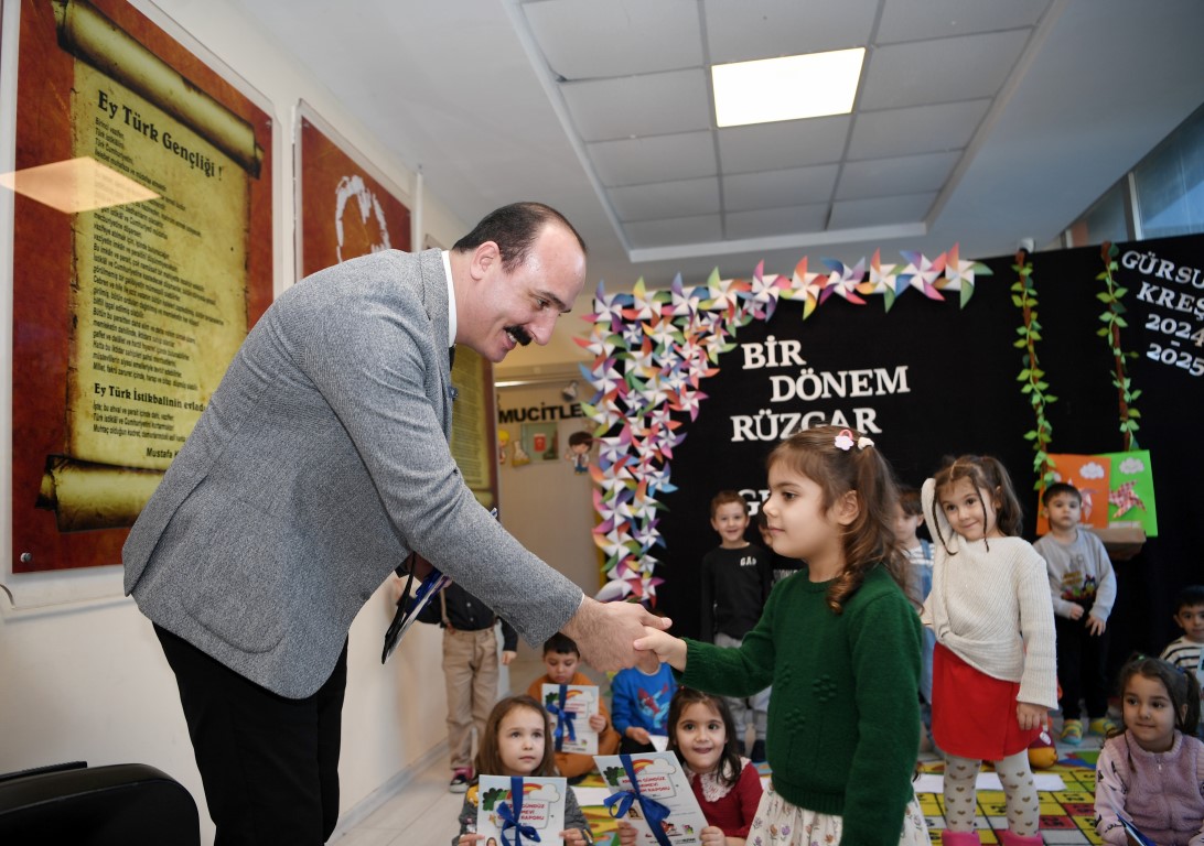 Konyaaltı Belediyesi bünyesinde bulunan Toros, Gürsu, Uncalı ve Hurma Kreş ve Gündüz Bakımevleri’nde eğitim gören minikler, 2024-2025 eğitim öğretim yılı birinci döneminin sona ermesiyle birlikte karnelerini aldılar. Günün ilk saatlerinde eşi Demet Ayne Kotan ile birlikte oğlu Can Ali’nin karne törenine katılan Başkan Kotan, daha sonra ise Gürsu Kreşi’nde düzenlenen karne töreninde 3, 4 ve 5 yaş sınıflarında eğitim gören miniklerin karne sevinçlerine ortak oldu. İlk kez karne heyecanı yaşayan minikler karne sevinci yaşarken çok renkli görüntüler oluşturdu. Başkan Kotan öğrencilerin gösterilerini aileleri ile birlikte izledikten sonra miniklere karnelerini takdim etti. Ailelerin de yoğun ilgi gösterdiği karne töreninde Başkan Kotan, hem çocuk hem de velilerle sohbet etti.