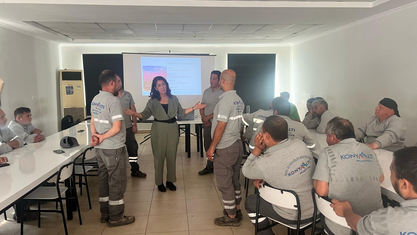 Konyaaltı Belediyesi, ilçedeki hizmet kalitesini artırmak amacıyla personeline yönelik eğitimlerine devam ediyor. Bu kapsamda özellikle sahada görev yapan personele teorik ve pratik eğitimler uygulayan Konyaaltı son olarak, Park ve Bahçeler Müdürlüğü bünyesindeki personeline Doç. Dr. Sevinç Ateş’in de katılımıyla; budama, bahçe bakımı ve ilaçlama eğitimi verdi. Uzman bilgileriyle eğitimi veren Doç. Dr. Sevinç Ateş’e ise eğitim sonunda teşekkür belgesi takdim edildi.