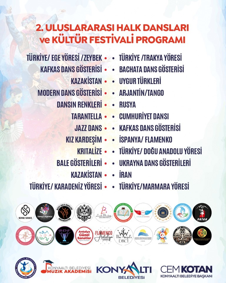 Konyaaltı Belediyesi, 29 Ekim Cumhuriyet Bayramı ve Cumhuriyetin kuruluşunun 102’nci yıl dönümü kutlamaları kapsamında düzenleyeceği etkinliği açıkladı. Konyaaltı Belediyesi resmi sosyal medya hesaplarından yapılan duyuruya göre Cumhuriyet Bayramı ve Uluslararası 2. Halk Dansları Kültür Festivali, 28 Ekim Salı günü Nazım Hikmet Fuar ve Kongre Merkezi’nde gerçekleşecek. Konyaaltı Belediyesi yetkililerinden edinilen bilgiye göre saat 15.00’te başlayıp 20.00’de sona erecek olan kutlamalarda, halk dansları gösterilerinin yanı sıra kültür stantları, el emeği stantları ve çocuklar için etkinliklerin de yer alacağı bildirildi. Öte yandan vatandaşlar 0242 245 55 25 numaralı hattan etkinlikle ilgili detaylı bilgiye ulaşabilecek.