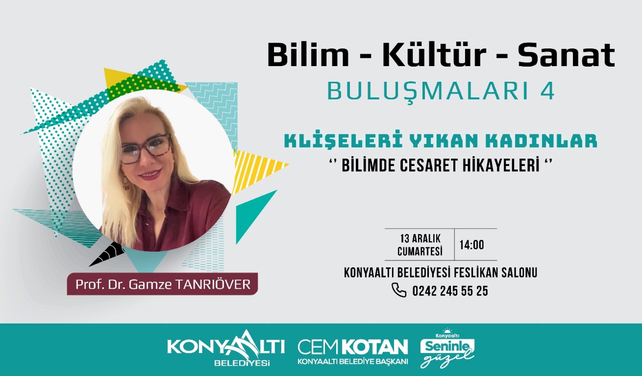 Konyaaltı Belediyesi, Bilim-Kültür-Sanat Buluşmaları’nın dördüncüsünü düzenleyeceğini duyurdu. Konyaaltı Belediyesi Kültür, Sanat ve Sosyal İşler Müdürlüğü’nden edinilen bilgiye göre buluşmanın, ‘Klişeleri Yıkan Kadınlar’ konusu altında ‘Bilimde Cesaret Hikayeleri’ adıyla düzenleneceği kaydedildi. Prof. Dr. Gamze Tanrıöver'in sunumuyla gerçekleşecek 4’üncü Bilim-Kültür-Sanat Buluşması, 6 Aralık Cumartesi günü saat 14:00’te Konyaaltı Belediyesi Ana Hizmet Binası içerisinde yer alan Feslikan Salonu’nda düzenlenecek.