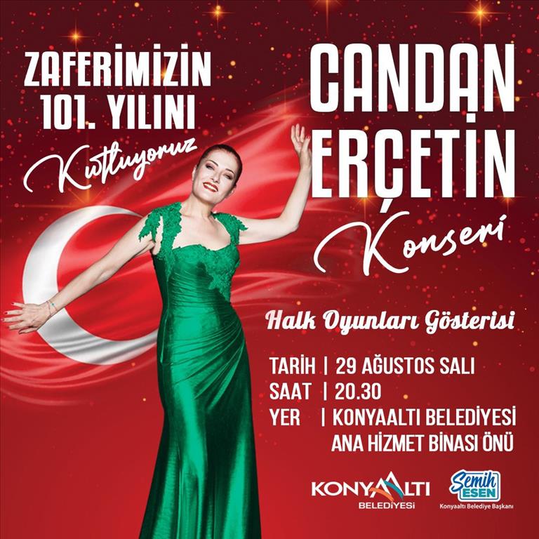 30 Ağustos Zafer Bayramı’nın 101. yılı tüm yurtta olduğu gibi Konyaaltı ilçesinde de coşkuyla kutlanacak. Konyaaltı Belediyesi, Zaferin 101. yılını sevilen sanatçı Candan Erçetin’in vereceği konserle kutlayacak. Ücretsiz düzenlenecek etkinlikte Konyaaltı Belediyesi Halk Oyunları Gösterisi de gerçekleştirilecek.