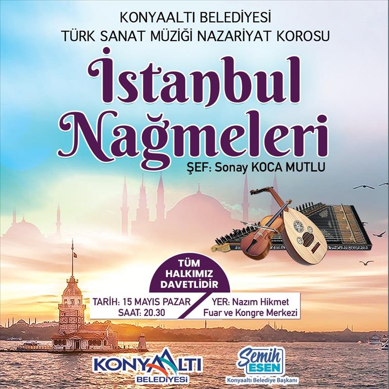 Kültür ve sanat etkinlikleri ile vatandaşları buluşturmaya devam eden Konyaaltı Belediyesi şimdi de Türk Sanat Müziği severlere müzik ziyafeti sunacak. Konyaaltı Belediyesi Türk Sanat Müziği Nazariyat Korosu müzikseverlerle buluşacak. 15 Mayıs Pazar günü saat 20.30’da, Sonay Koca Mutlu’nun şefliğindeki konserde sahne alacak koro müzik ziyafeti sunacak. Türk Sanat Müziği’nin sevilen eserlerinin seslendirileceği İstanbul Nağmeleri konseri Nazım Hikmet Fuar ve Kongre Merkezi’nde gerçekleştirilecek.