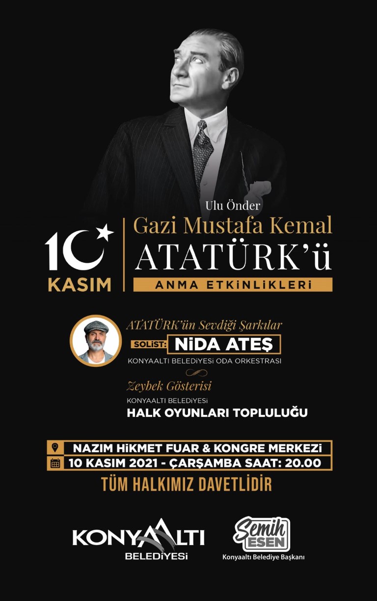 Konyaaltı Belediyesi, Türkiye Cumhuriyeti’nin kurucusu Mustafa Kemal Atatürk’ü, ölüm yıl dönümünde dolu dolu bir program ile anacak. 10 Kasım Çarşamba günü saat 20.00’de Nazım Hikmet Fuar ve Kongre Merkezi’nde başlayacak anma programında, Türk Halk Müziği sanatçısı Nida Ateş Konyaaltı Belediyesi Oda Orkestrası ile birlikte Atatürk’ün sevdiği şarkıları seslendirecek. Konyaaltı Belediyesi Halk Oyunları Topluluğu’nun da zeybek gösterisi ile yer alacağı anma programına vatandaşlar ücretsiz olarak katılabilecek.