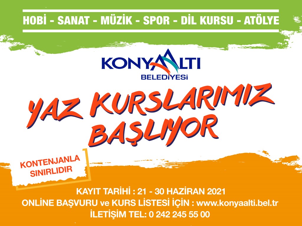 Konyaaltı Belediyesi Sanat Eğitim Merkezi (KONSEM) bünyesinde yetişkin ve çocuklara yönelik 2021 yaz dönemi hobi, sanat, müzik, spor, dil ve atölye kursları başlıyor. Uzman eğitmenler eşliğinde plates, yoga, ahşap boyama, seramik, resim, halk oyunları, jimnastik, drama, İngilizce, bağlama, zumba, orf eğitimi, taekwondo, futbol, basketbol, tenis, hentbol ve badminton branşlarında kurslar düzenlenecek. 18 farklı branşta açılacak 83 kursa başvurular 21-30 Haziran tarihleri arasında www.konyaaalti.bel.