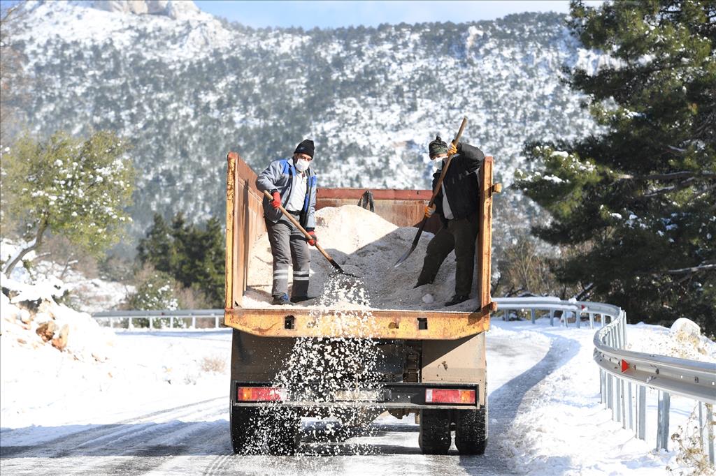 Konyaaltı Belediyesi Fen İşleri Müdürlüğü ekipleri, iki gün önce yağan ve ilçenin yüksek kesimlerinde etkili olan kar yağışı sonrası bölgedeki çalışmalarını sürdürüyor. 24 saat boyunca yayla yollarındaki kavşaklarda hazır bekleyen belediye ekipleri, sabahın ilk ışıklarıyla yolların buzlanmaması için kar temizleme ve tuzlama çalışması gerçekleştiriyor. Konyaaltı Belediyesi, Saklıkent, Çağlarca ve Feslikan yolunda çalışmalarını aralıksız sürdürerek bölge halkının sağlıklı bir şekilde ulaşım yapmalarını sağlıyor.