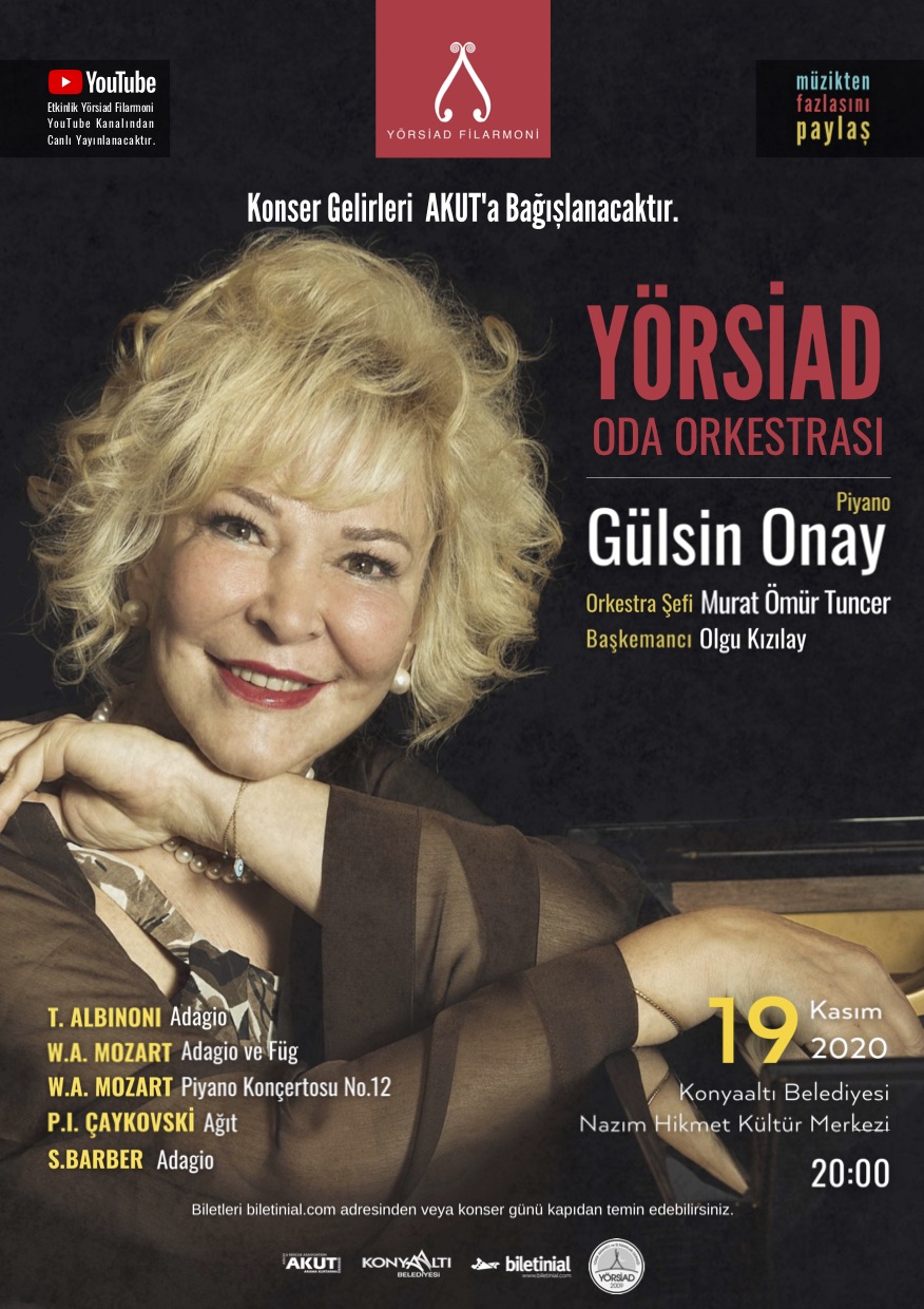 Konyaaltı Belediyesi, Arama Kurtarma Derneği’nin (AKUT) yararına YÖRSİAD ile özel bir konsere hazırlanıyor. Türkiye’nin piyanoda adını duyuran Gülsin Onay, YÖRSİAD Filarmoni ile sahneye çıkacak. 19 Kasım Perşembe günü düzenlenecek konser saat 20.00’de, Nazım Hikmet Fuar ve Kongre Merkezi’nde gerçekleşecek. Konserin bilet satışlarından elde edilecek gelir, AKUT’a bağışlanacak.