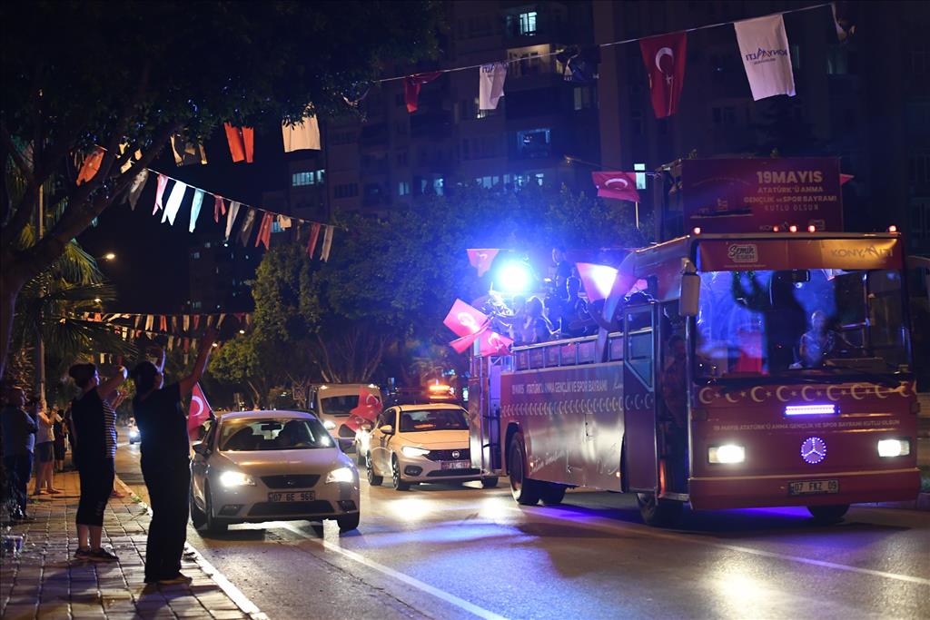 19 Mayıs Atatürk’ü Anma Gençlik ve Spor Bayramı’nın 101’inci yılı tüm Türkiye’de olduğu gibi Konyaaltı’nda da büyük bir coşkuyla kutlandı. Koronavirüs tedbirleri nedeniyle kutlamalar bu yıl evlerde gerçekleştirilirken, Türkiye genelinde vatandaşların katılımıyla saat 19.19’da balkonlardan İstiklal Marşı’nı okuma etkinliğine Konyaaltı ilçesinde yoğun katılım oldu. Konyaaltı Uluç Mahallesi’nde, Nadirkent ve Güneykent sitesi sakinleri, bahçelerini Atatürk ve Türk bayraklarıyla donattı. Saatler 19.