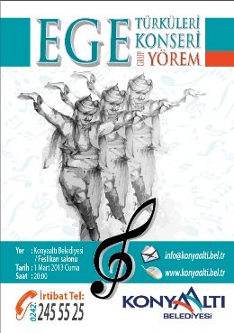 Konyaaltı Belediyesi Kültür ve Sosyal İşler Müdürlüğü, Ege Türküleri Konseri düzenliyor1 Mart Cuma Günü Konyaaltı Belediyesi Feslikan Salonu’nda saat 20.00’de düzenlenecek konserde Grup Yörem sahne alacak. Yusuf Yıldız’ın Orkestra Şefliğini yapacağı konserde Solist Gözde Güneş’e, bağlamada Ahmet Ali Selçuk, kavalda Ali Bedel, kabak kemanede Veli Yöntem, davulda Metin Yıkmaz, klavyede Yusuf Yıldız eşlik edecek. Ege’nin çeşitli yörelerine ait türkülerin seslendirileceği konserde Kırmızı Buğday, Gerizler Başı, Kara Üzüm Salkımı, Ah Bir Ataş Ver, Ormancı, İzmir’in Kavakları, Desti İçinde Pekmez, Kerimoğlu Zeybeği, Çökertme, Ataş Attım Samana, Bozdoğan Zeybeği, Tepside Tepsi Fındıklar, Elimdedir Bağlama gibi sevilen eserlerde yer verilecek..