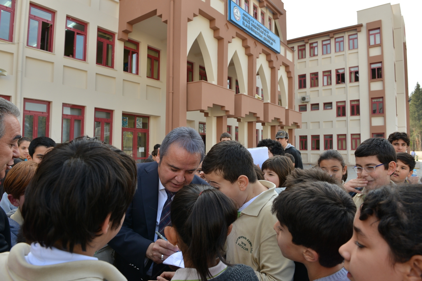 Öğrencilerin daha rahat eğitim alabilmeleri için her fırsatta onların taleplerini dinleyen ve istekleri yerine getiren Konyaaltı Belediye Başkanı Muhittin Böcek, son olarak Gazi Mustafa Kemal Atatürk İlköğretim okulunu ziyaret etti. Bu ziyareti sırasında hem öğretmenlerin hem de öğrencilerin taleplerini dinleyen Başkan Böcek okullarda, bahçe düzenlemesi, temizlik, araç gereç eksiğinin giderilmesi ve boya gibi pek çok konuda destek oluyor. Öğrencilerden büyük ilgiGazi Mustafa Kemal İlköğretim Okulu’nun yönetimi ve öğrencileri tarafından oldukça sıcak karşılanan Başkan Muhittin Böcek, görev süresince okullarda öğrenci ve öğretmenleri ziyaret etmeyle büyük önem gösterdiğini söyledi. Bu ziyaretleri sırasında kendisine okullardan bir takım talepler geldiğini ve bunların büyük bir bölümünü karşıladıklarını da dile getiren Başkan Böcek, ülkemizi yarınlara taşıyacak olan gençlere her türlü desteği vermeye hazır olduklarını bildirdi.Öğrencilerle birlikte 2013 yılı hatırasıBöcek, yapmış olduğu ziyaretten son derece memnun kaldıklarını dile getiren öğretmenlere küçükte birer hediye verdi.