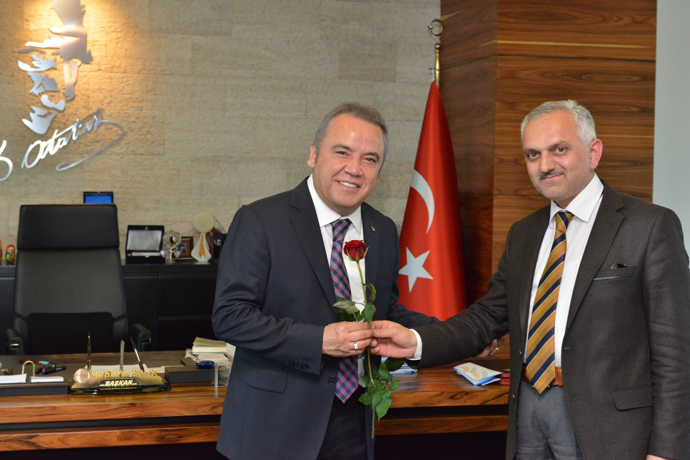 Bu yıl “Hz. Peygamber ve İnsan Onuru” temasıyla kutlanan Kutlu Doğum Haftası etkinlikleri kapsamında Konyaaltı İlçe Müftüsü Hüseyin Uysal, birim müdürleriyle birlikte Konyaaltı Belediye Başkanı Muhittin Böcek’i makamında ziyaret etti. Ziyaretten duyduğu memnuniyeti dile getiren Başkan Muhittin Böcek, Peygamber Efendimizin doğum yıl dönümünün kutlandığı Kutlu Doğum Haftası’nda İlçe Müftülüğü’nün hazırladığı etkinliklere Konyaaltı Belediyesi olarak destek olduklarını bildirdi. Konyaaltı İlçe Müftüsü Hüseyin Uysal, Konyaaltı Belediyesi’nin kendilerine verdiği desteklerden ötürü Başkan Böcek’e teşekkür ederken, Kutlu Doğum Haftası etkinliklerine çerçevesinde belediye personeline kırmızı gül dağıttı..