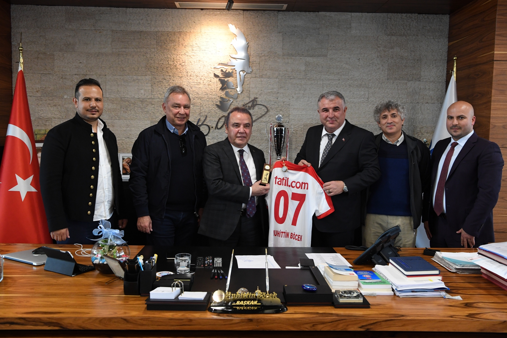 Kimi zaman formasıyla kimi zaman ise atkısıyla tribünlerde yerini alan Konyaaltı Belediye Başkanı Muhittin Böcek, Antalyaspor’u her zaman gönülden destekleyen isim oldu. İşte onun bu sevgisi, kulübün en üst düzey isimleri tarafından da takdir edildi.Antalyaspor Yönetim Kurulu Başkanı Cihan Bulut, Antalyaspor As Başkanı Şefik Öz, Yönetim Kurulu Üyeleri Prof.Dr. Ömer Özkan, Ramazan Karabulut ve Antalyaspor Genel Müdürü Adem Kurt ile birlikte Başkan Muhittin Böcek’i makamında ziyarete etti.