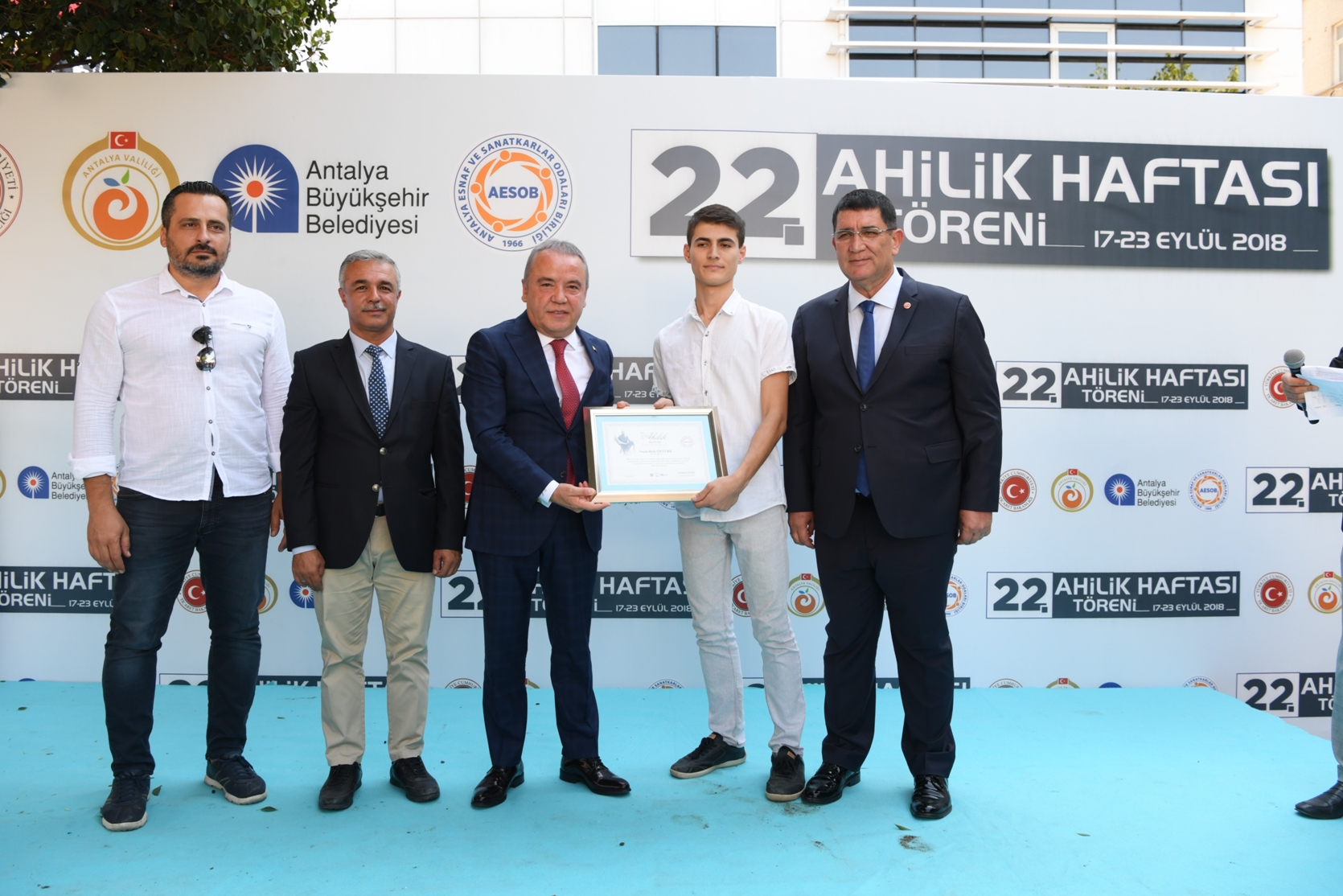 Sobacılar Çarşısı içerisindeki Ahi Evran Meydanı'nda 22. Ahilik Haftası Töreni gerçekleştirildi. AESOB Başkanı Adlıhan Dere’nin ev sahipliğinde gerçekleştirilen törene, Konyaaltı Belediye Başkanı Muhittin Böcek’in yanı sıra Vali Münir Karaloğlu, belediye başkanları ve milletvekilleri ile çok sayıda kurum-kuruluş temsilcisi katıldı.Törende 'Ahi Babası' olarak bilinen AESOB Başkanı Adlıhan Dere, günün anlam ve önemini belirten konuşma yaptı. Konuşmaların ardından AHİLİK geleneklerine göre belirlenen yılın esnaf ve çıraklarına hazırun tarafından plaket takdim edildi.