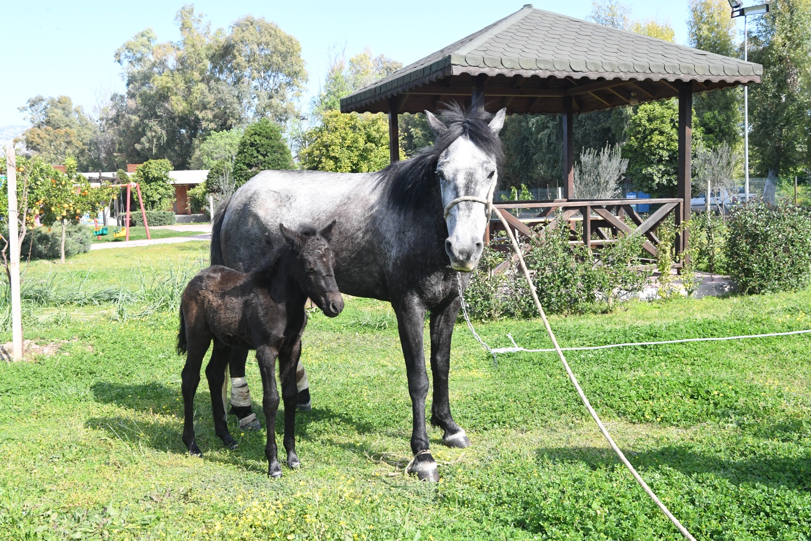Konyaaltı Belediyesi ekipleri, Saklıkent mevkii yakınlarında yaralı bir at ihbarı aldı. Ekipler, iki ayağına tel dolaşmış ve yaralı halde bulunan bir at ve yavrusunu Konyaaltı Belediyesi Sokak Hayvanları Sağlık ve Rehabilitasyon Merkezi’ne getirdi. Ayakta durmakta zorlanan ve yarası açılan at hemen ameliyata alındı. Konyaaltı Belediyesi Veteriner İşleri Müdürü Mutlu Karacaoğlu ve veteriner hekimler, bir saatlik süren operasyonla atın iki ayağına dolaşmış yaklaşık 75 santimetre boyundaki teli çıkardı. Yarası temizlenen at, pansuman ve antibiyotik tedavisi uygulandı.