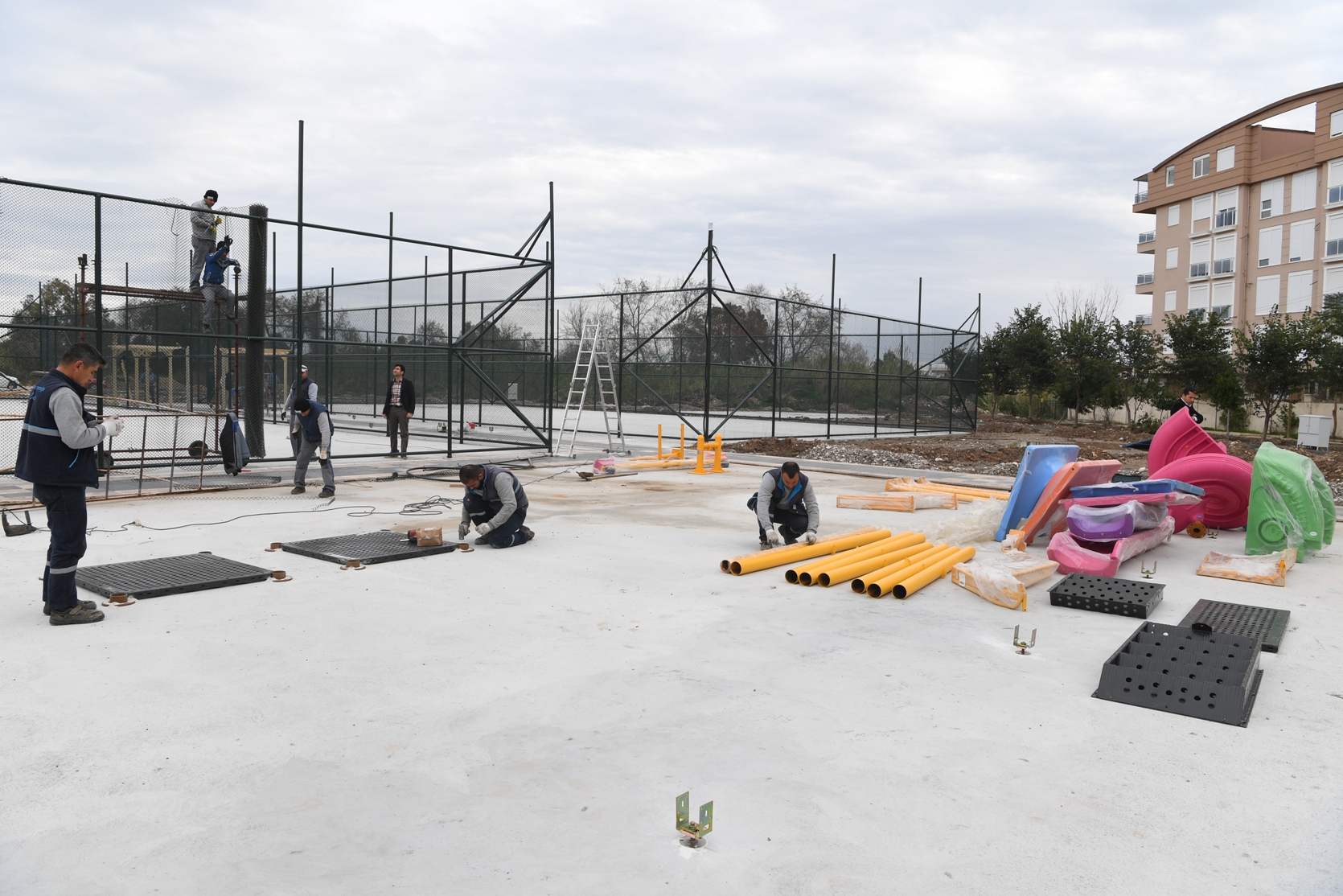 Hurma Mahallesi’nde sıcak asfalt ve kaldırım çalışmalarını tamamlayan Konyaaltı Belediyesi, şimdide bölgeye dev bir ‘spor park’ı inşa ediyor. Hurma Mahallesi’nde 209-210 Sokak kesişiminde yer alan 7 bin 500 metrekare alana inşa edilen parkın içersinde basketbol sahası, tenis kortu, sokak tipi fitnes aletleri ve koşu yolu yer alacak. Konyaaltı Belediyesi Park ve Bahçeler Müdürlüğü tarafından yapımı büyük ölçüde tamamlanan spor parkı çocuk oyun alanı, yürüme yolları, mini meydan ve oturma alanlarıyla da bölge de yaşayan 7’den 70’e herkes için yeni yaşam alanı oluşturuyor.Konyaaltı Belediye Başkanı Muhittin Böcek, İlçenin yeşil dokusunu korumak ve geliştirmek adına park ve meydan projelerini büyük bir titizlikle hayata geçirdiklerini söyledi. Hurma Mahallesi’nde yapımını büyük ölçüde tamamladıkları spor parkı ile de bölge halkına yeni yaşam merkezi sunduklarını dile getiren Başkan Böcek şöyle konuştu; “Sıcak asfalt ve kaldırım çalışmalarının tamamlandığı Hurma Mahalle’mizde yeni park çalışmasının sonuna geldik.