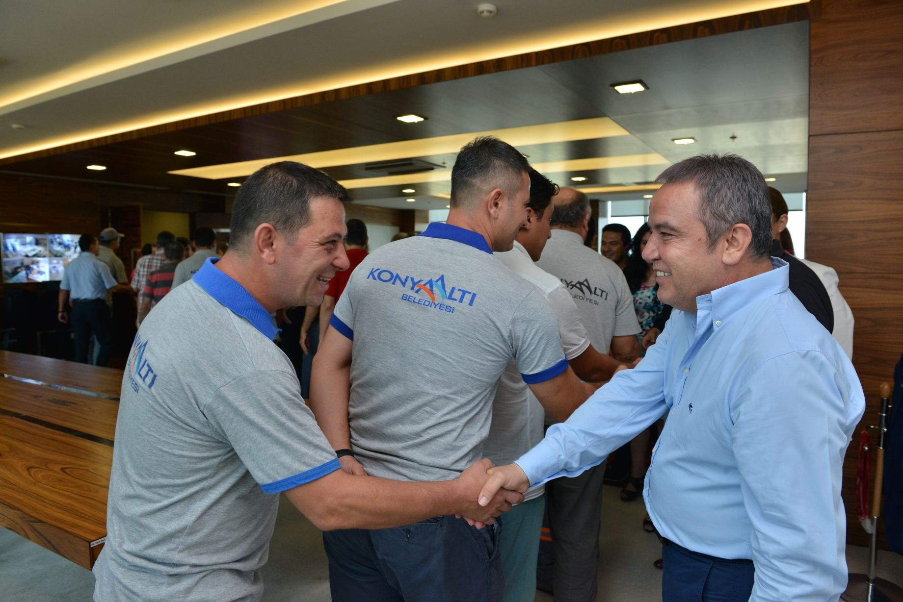 Konyaaltı Belediyesi’nin geleneksel bayramlaşma töreni başkanlık makamında gerçekleşti. Başkan Yardımcıları, birim müdürlerinin de hazır bulunduğu bayramlaşma töreninde Başkan Muhittin Böcek, tek tek belediye personeli ile bayramlaştı.Savaşların olmadığı, barışın hakim olduğu bir bayram olması temennisinde bulunan Başkan Böcek, “Kurban Bayramı’nda aileniz ve sevdikleriniz ile mutlu bir bayram geçirmenizi diliyorum. Keseceğiniz kurbanları Allah kabul etsin. Ülke olarak zor günlerden geçiyoruz.
