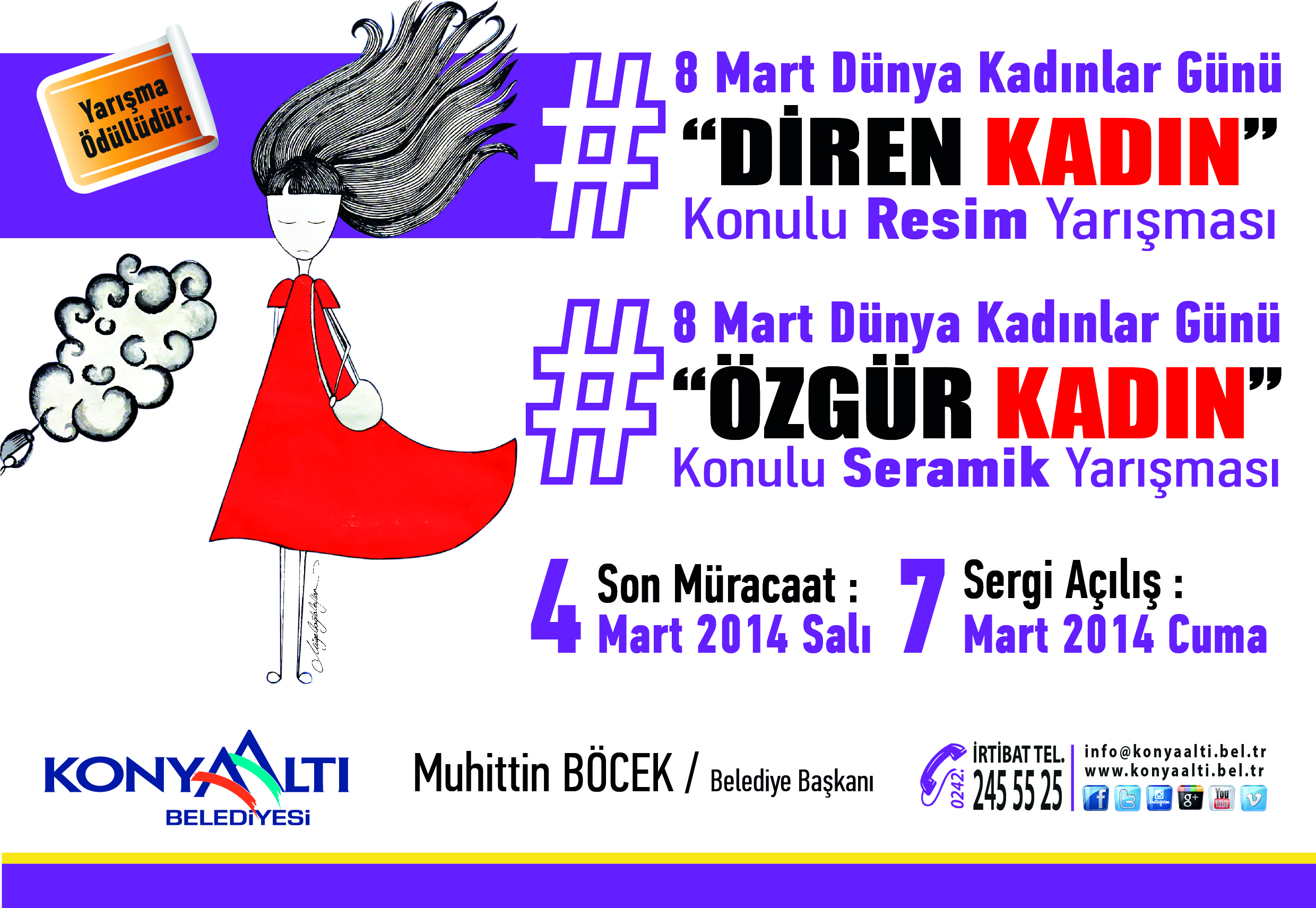 8 Mart Dünya Kadınlar Günü’ne iki özel yarışma hazırlayan Konyaaltı Belediyesi, şimdiden müracaat kabulüne başladı. “Özgür Kadın” konulu seramik yarışması ve “Diren Kadın” konulu resim yarışması ile kadınlar tüm hünerlerini ortaya koyacak. Yarışma sonunda derece elde eden eserler, 7 Mart Cuma günü açılışı yapılacak olan sergide görücüye çıkacak.4 Mart Salı günü iki yarışma içinde son müracaat günü. Konyaaltı Belediyesi tarafından organize edilen yarışmalarda derece elde eden kadınlara çeşitli ödüller verilecek.