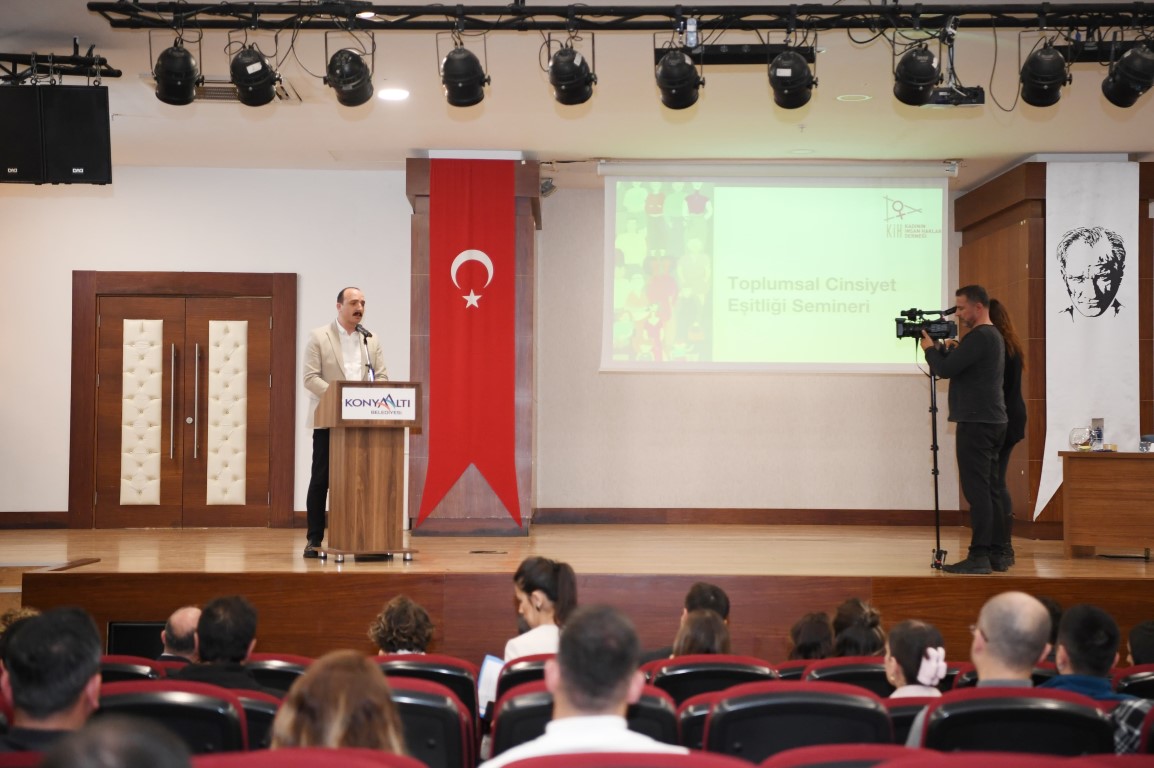 Konyaaltı Belediyesi toplumsal cinsiyet eşitliği ve adil bir hizmet anlayışını hayata geçirme yolunda kararlı adımlarla ilerliyor. Başta Konyaaltı Belediye Başkanı Cem Kotan olmak üzere belediye yönetimi, Yerel Eşitlik Eylem Planı sürecinde kadın, erkek ve dezavantajlı personelle sık sık bir araya geliyor. Bu kapsamda Konyaaltı Belediyesi, hem ana hizmet binasında hem de dış birimlerde eğitim süreci başlattı. Kadının İnsan Hakları Eğitim Programı (KİHEP) Koordinatörü Duygu Dokuz, belediye personeline toplumsal cinsiyet eşitliğinin temel kavramlarının ve eşitlikle ilgili yasaların istatistiklerinin yer aldığı bir seminer verdi. Seminerde konuşan Konyaaltı Belediye Başkanı Cem Kotan, bu kapsamda ilk olarak Eşitlik Birimi'ni kurduklarını söyledi.